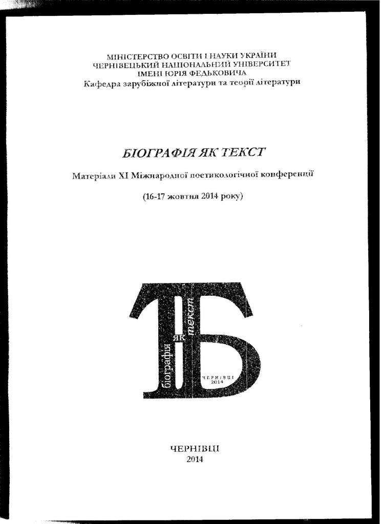 | 945 | Біографія як текст.ХІ Міжнародна поетикологічна конференція. | Создание биографии как вариативного текста. Вариант биографии Байрона - центральная проблема пьесы Тома Стоппарда 'Аркадия' (1993 г.) | Чернівецький національний університет імені Юрія Федьковича |