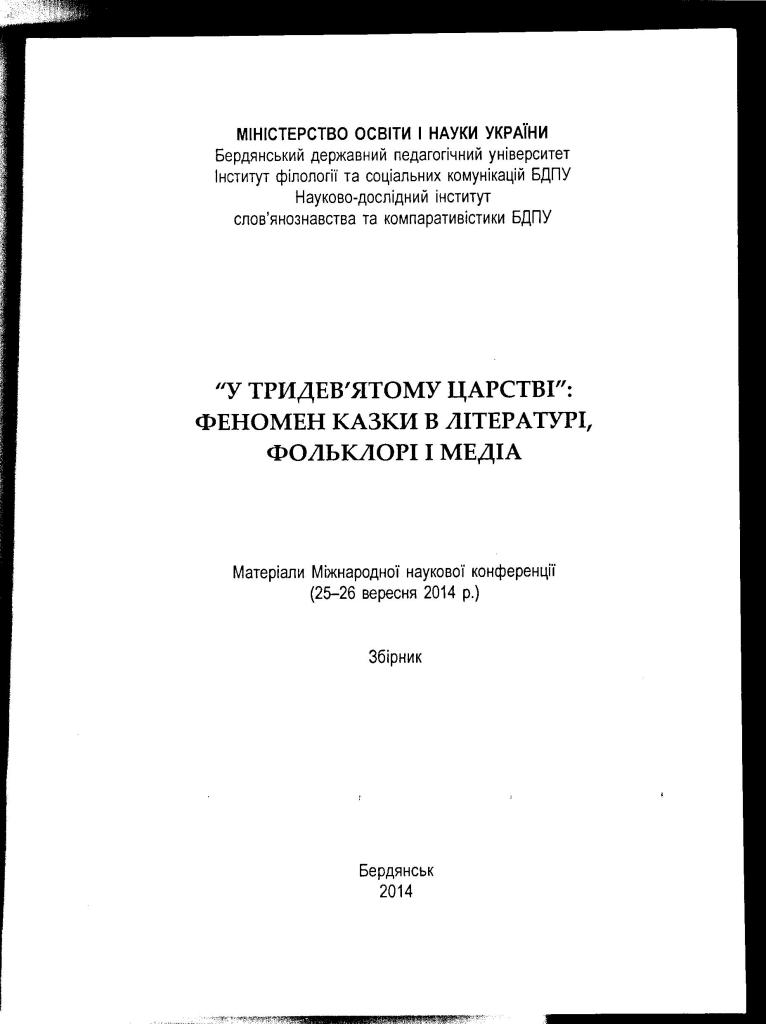| 946 | 'У тридев'ятому царстві': феномен казки у літературі,фольклорі і медіа. | Джоель Чандлер Гарріс 'Казки дядечка Римуса': імперативи дидактичного коду. | Бердянський державний педагогічний університет |