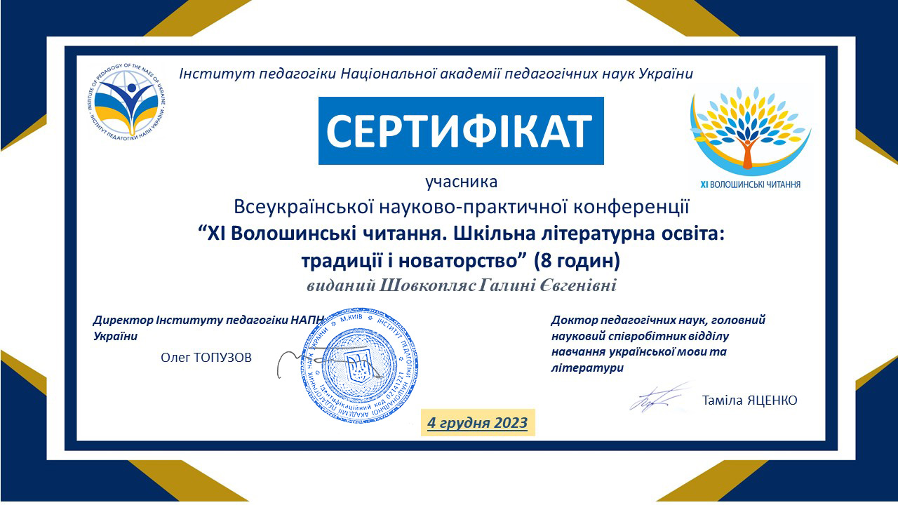| 950 | ІІІ Всеукраїнські Волошинські читання 'Ціннісні парадигми наукової спадщини Ніли Волошиної'. | Рівень викладання сучасної літератури як показник рівня професійного розвитку вчителя. | Черкаський національний університет імені Богдана Хмельницького |