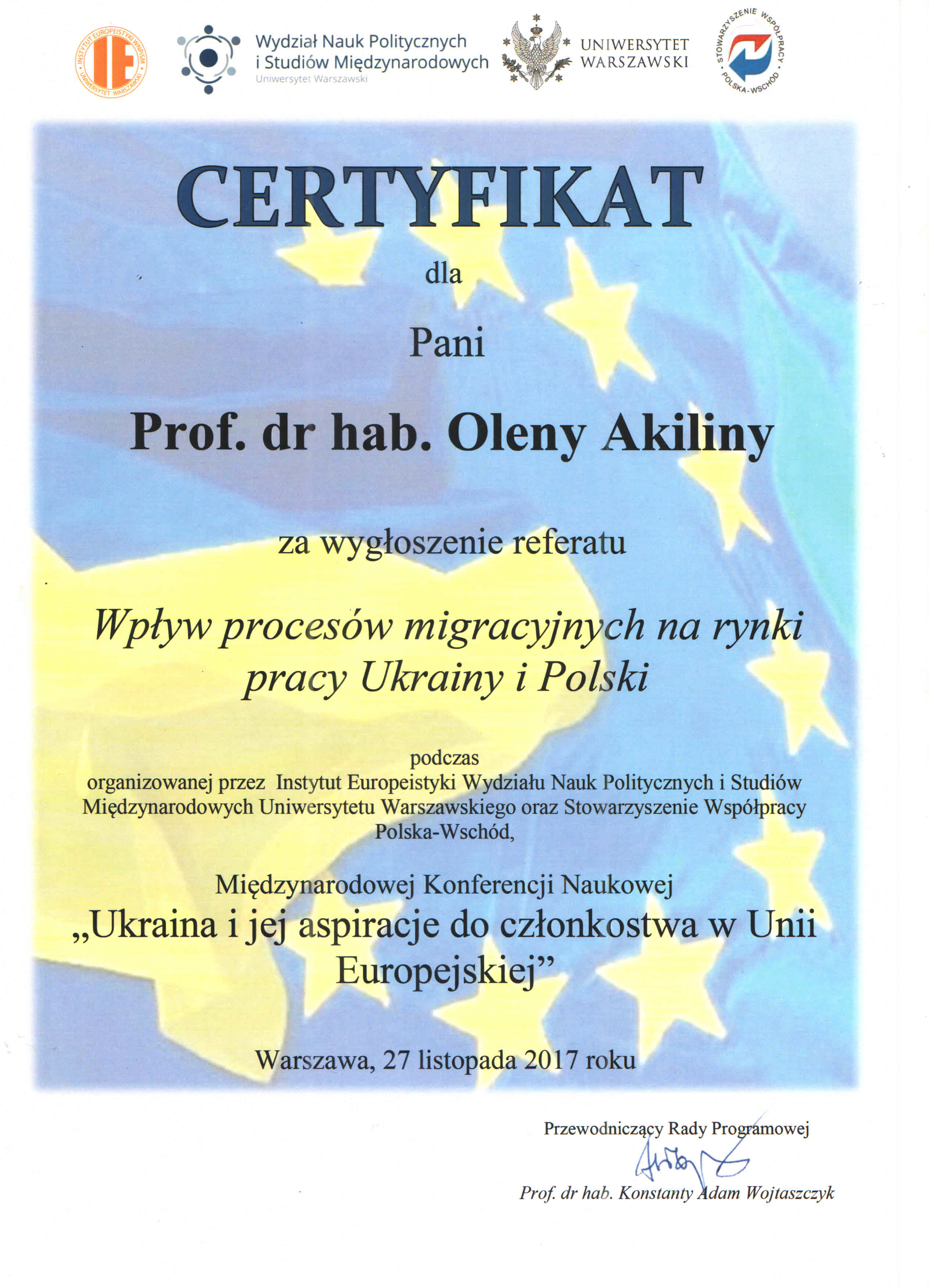 | 2388 | Наукова конференція «Україна та її прагнення до членства в Європейському Союзі» | Вплив міграційних процесів на ринок праці України та Польщі | Варшавський університет (м. Варшава, Польща) |