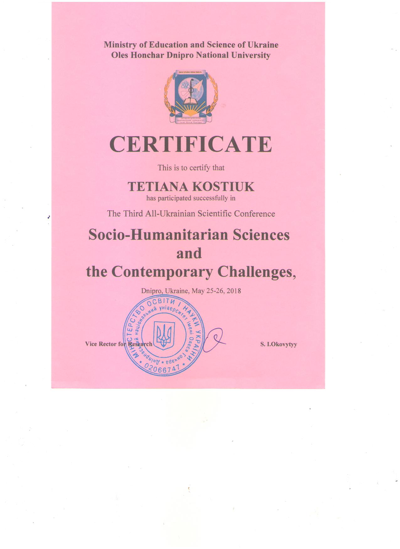 | 3472 | ІІІ Всеукраїнська наукова конференція «Соціально-гуманітарні науки та сучасні виклики» | POLITICAL AND SOCIAL DIMENSION OF INTERNATIO-NALIZATION OF HIGHER EDUCATION | м. Дніпро , ДНУ імені Олеся Гончара |