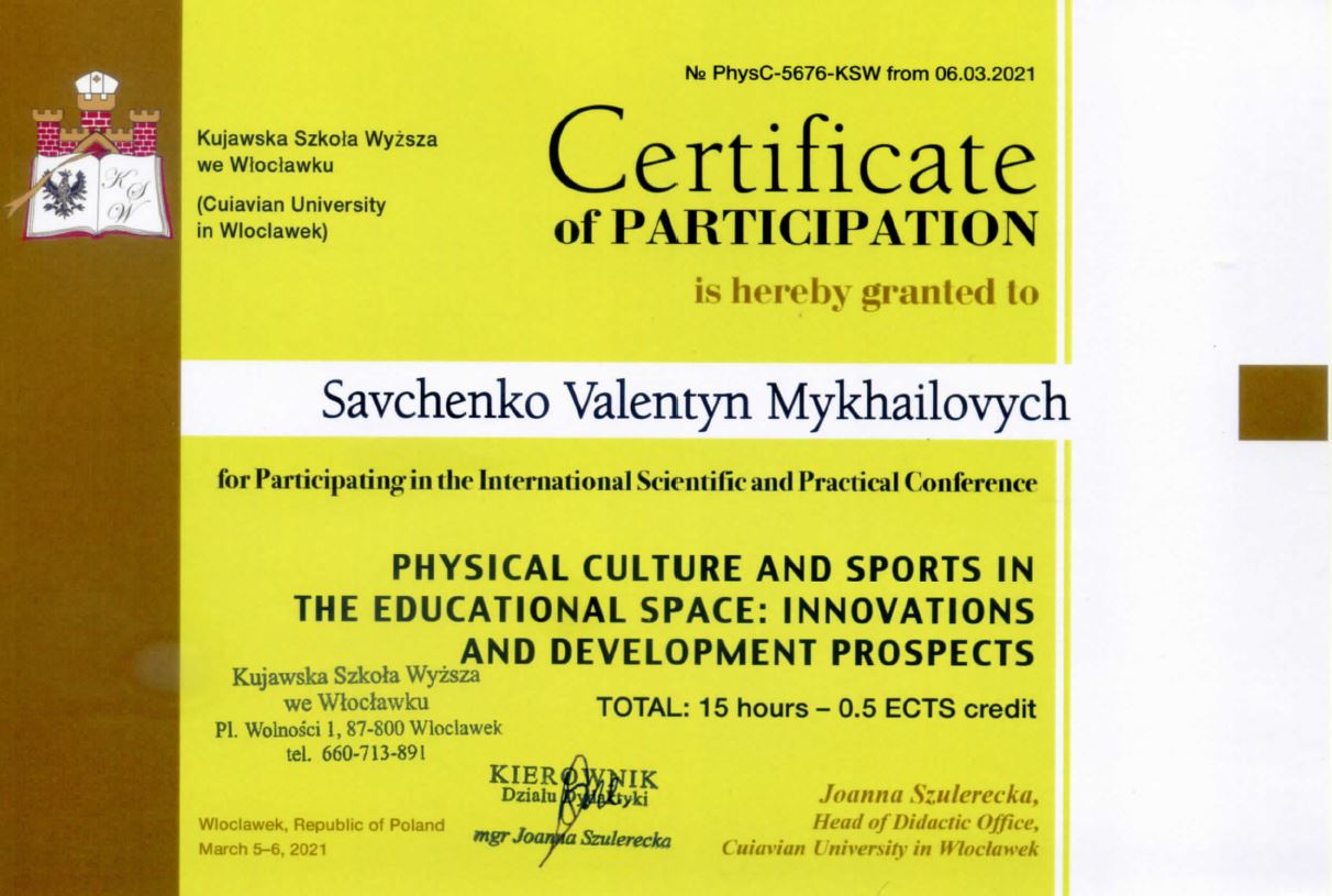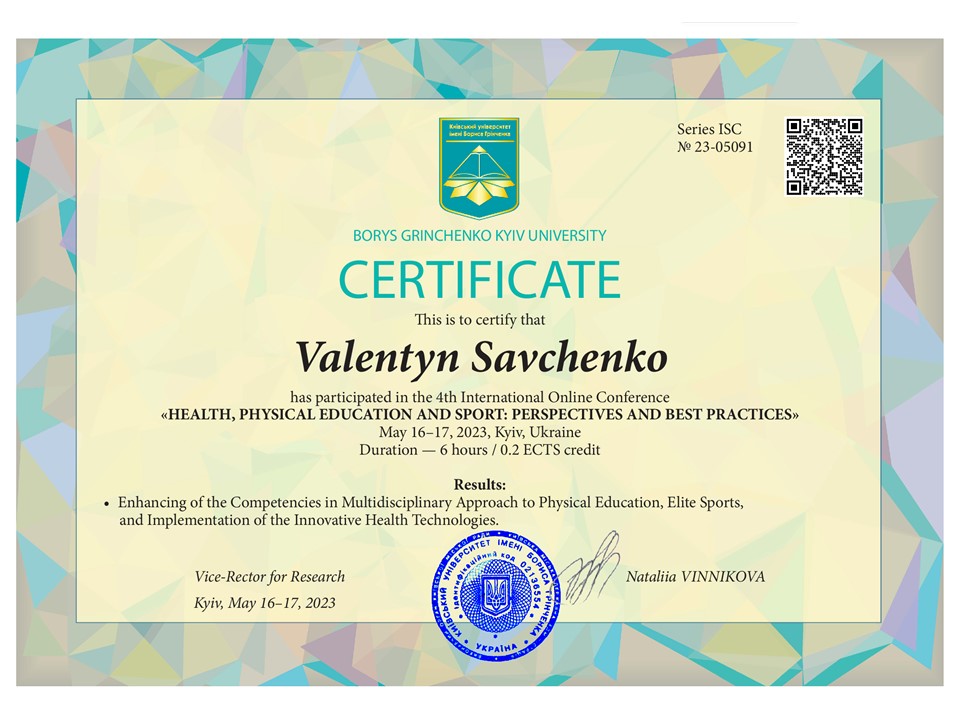 | 4537 | Міжнародна науково-практична конференція «ЗДОРОВ’Я, ФІЗИЧНЕ ВИХОВАННЯ І СПОРТ: ПЕРСПЕКТИВИ ТА КРАЩІ ПРАКТИКИ» | Учасник | Київ | document.pdf | |