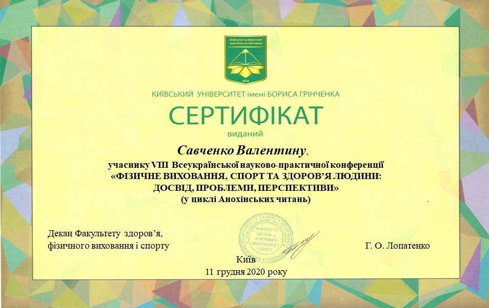 | 5027 | VІІ Всеукраїнська науково-практична конференція «ФІЗИЧНЕ ВИХОВАННЯ, СПОРТ ТА ЗДОРОВ’Я ЛЮДИНИ: ДОСВІД, ПРОБЛЕМИ, ПЕРСПЕКТИВИ» (У ЦИКЛІ АНОХІНСЬКИХ ЧИТАНЬ) | Учасник | Київ |