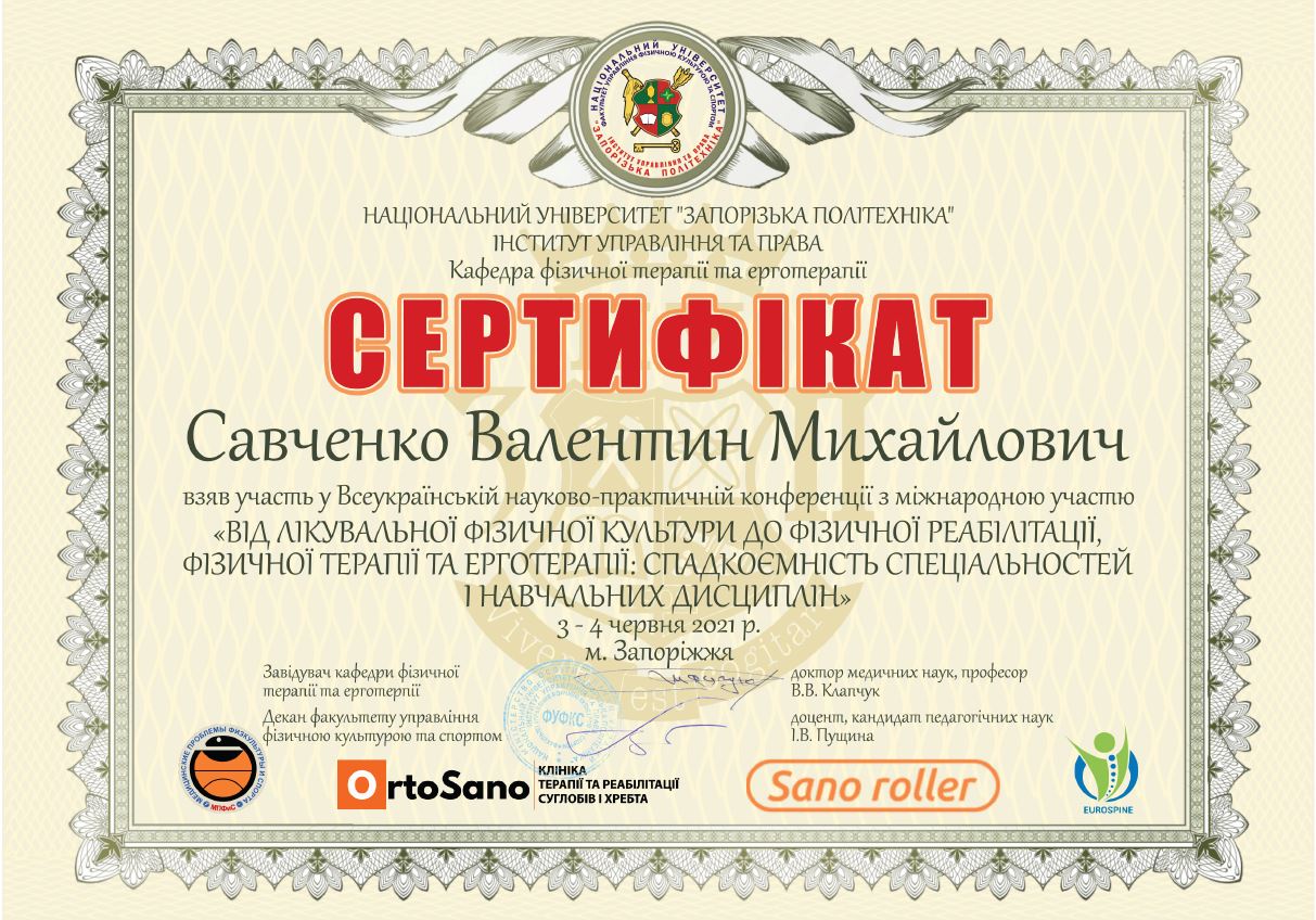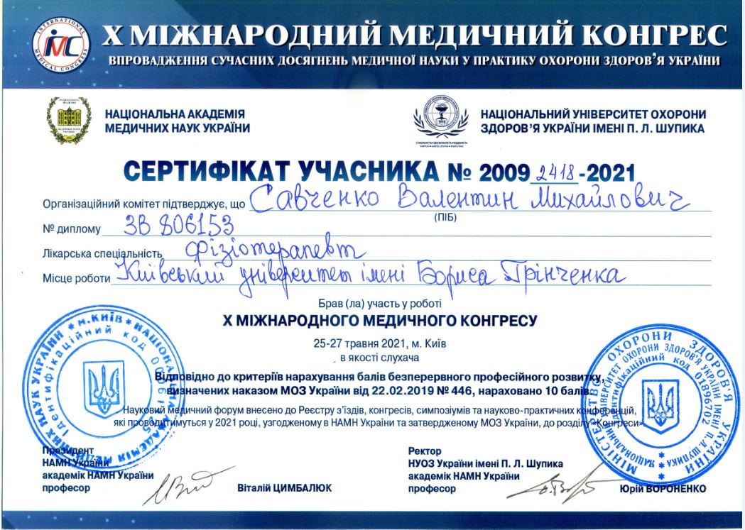 | 7896 | II Національний конгрес фізичної та реабілітаційної медицини «Фізичнa та реабілітаційна медицина в Україні: організація надання мультидисциплінарної реабілітаційної допомоги в закладах охорони здоров’я» | Учасник | Київ | document.pdf | |