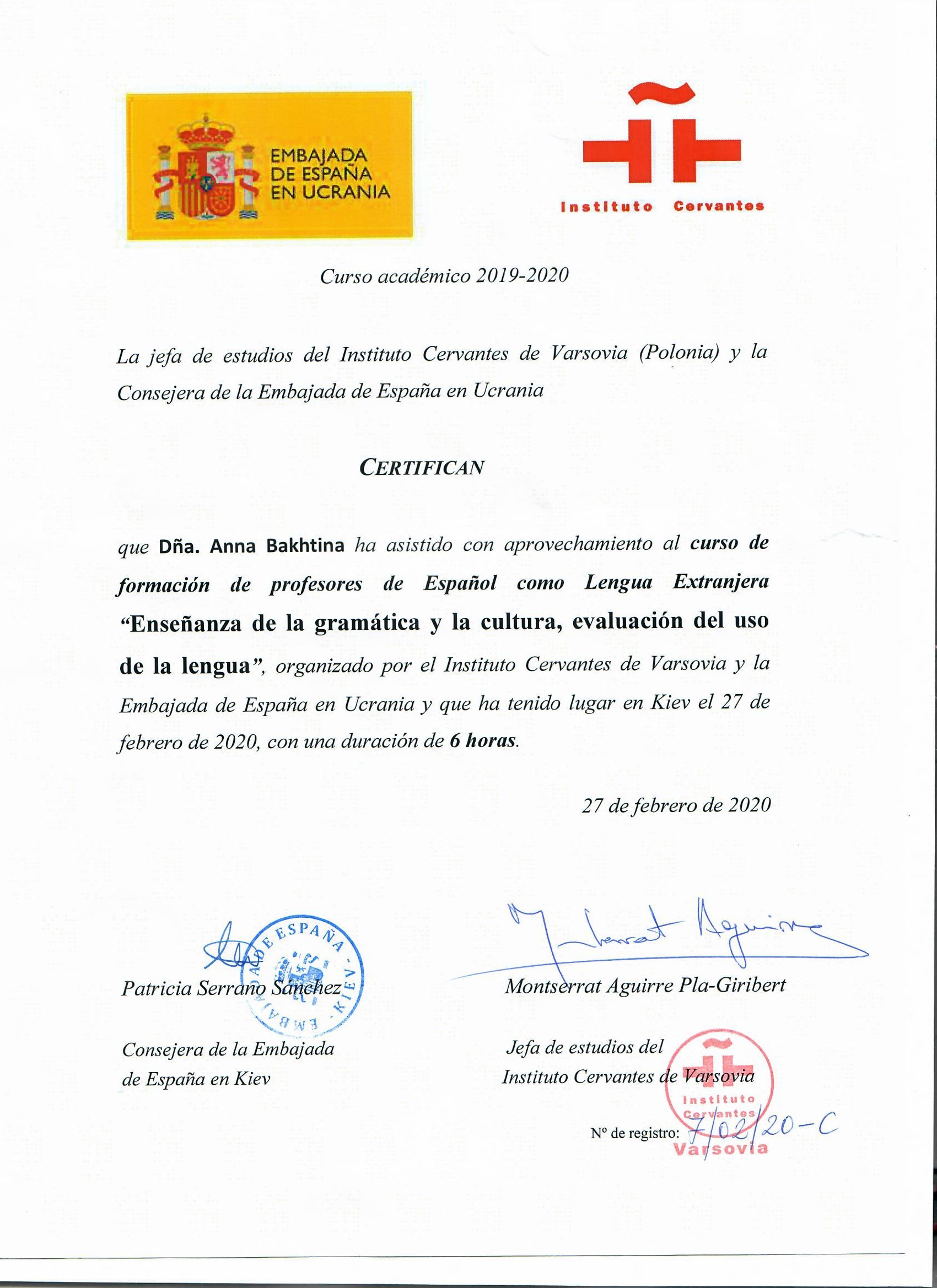 | 6334 | Curso de formación de profesores de Español como Lengua Extranjera | Enseñanza de la gramática y la cultura, evaluación del uso de la lengua | Instituto Cervantes de Varsovia y la Embajada de España en Ucrania. Kyiv, Ukraine |