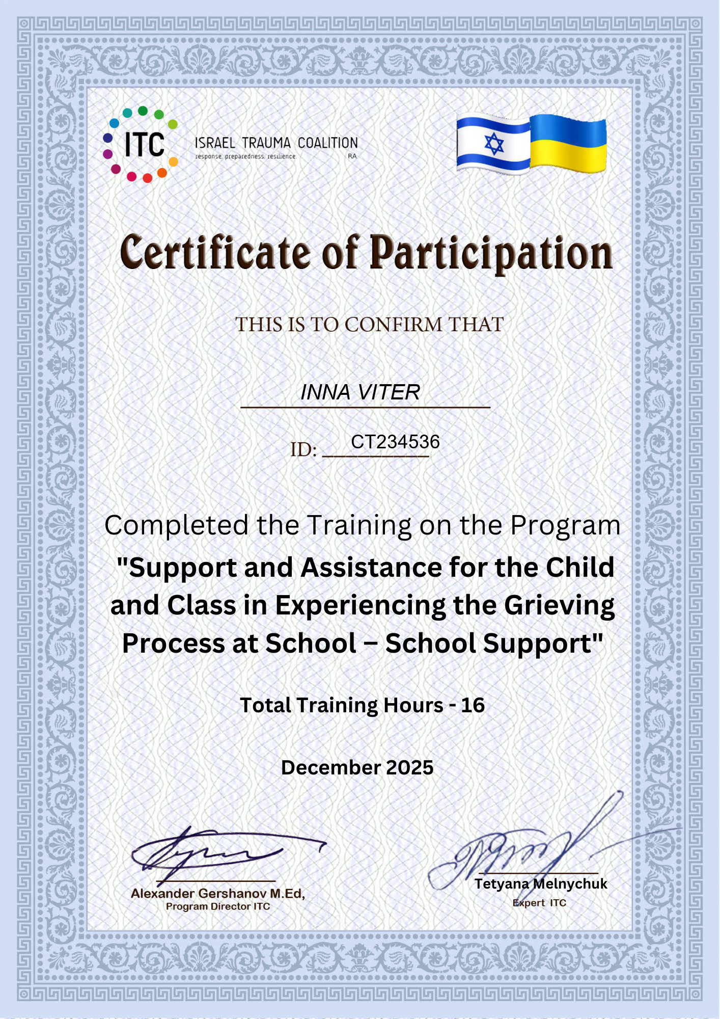 | 12929 | ISRAEL TRAUMA COALITION | Супровід та підтримка дитини і класу у переживанні процесу горювання у школі | Управління з питань гендерної рівності Київський центр стресостійкості |