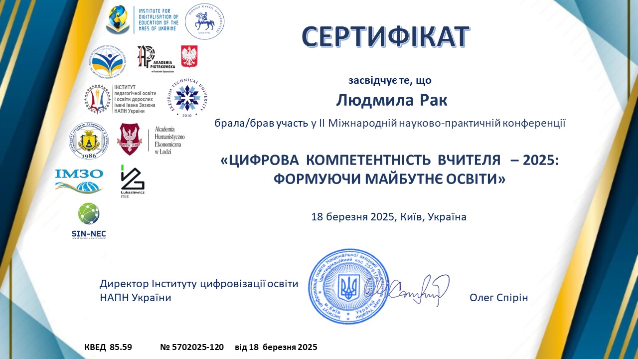 | 12871 | Цифрова компетентність вчителя - 2025: формуючи майбутнє освіти | учасник | ІІ Міжнародна науково-практична конференція. м.Київ. |