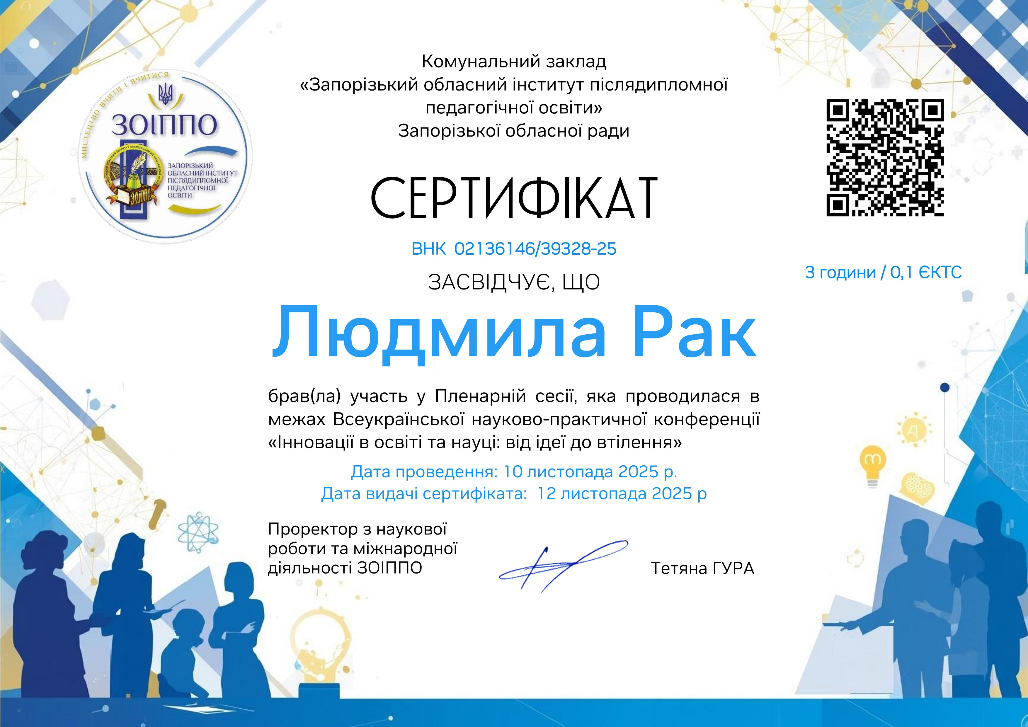 | 12873 | Інновації в освіті та науці: від ідеї до втілення | учасник | Пленарна сесія в межах Всеукраїнської науково-практичної конференції. М. Запоріжжя |