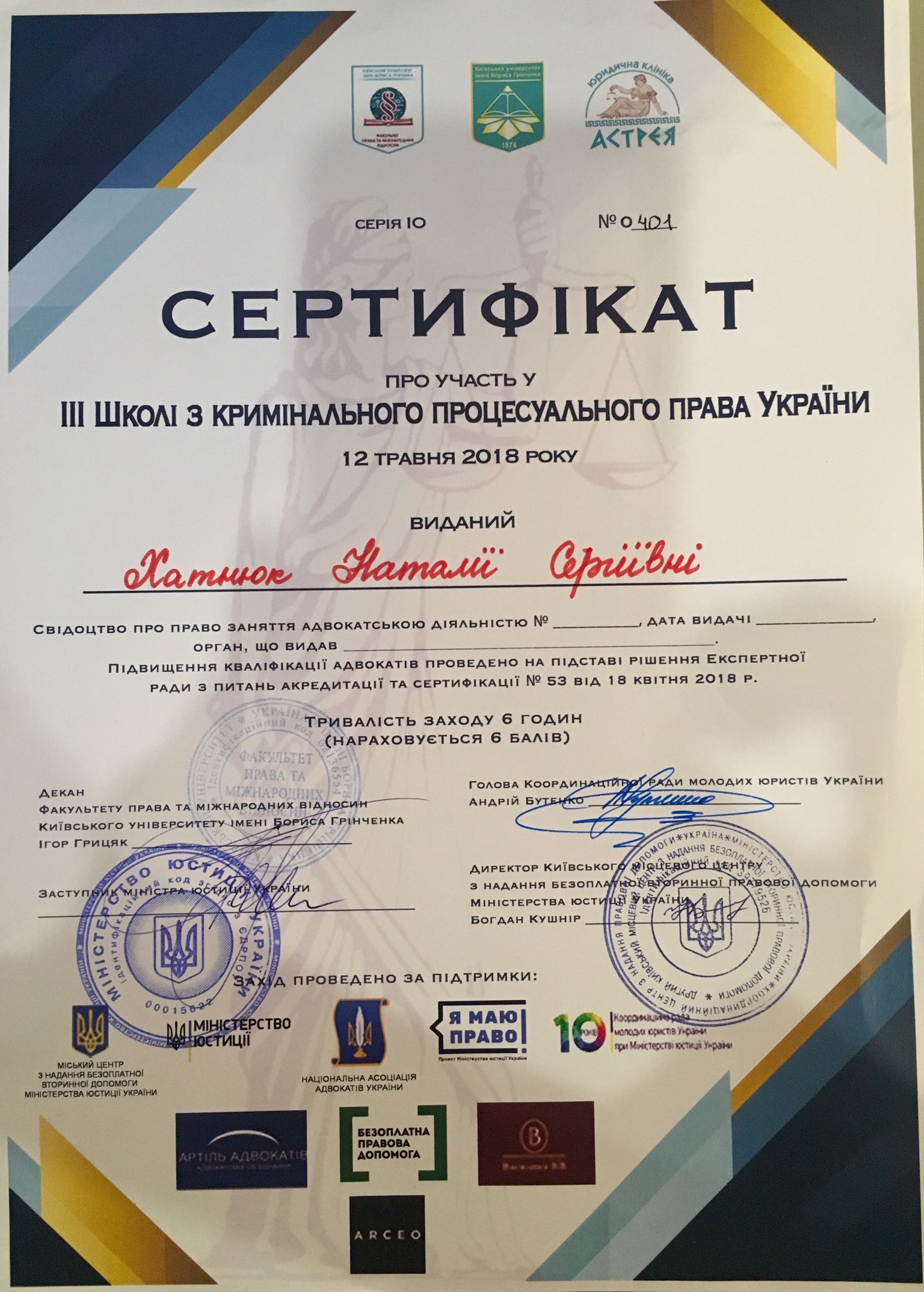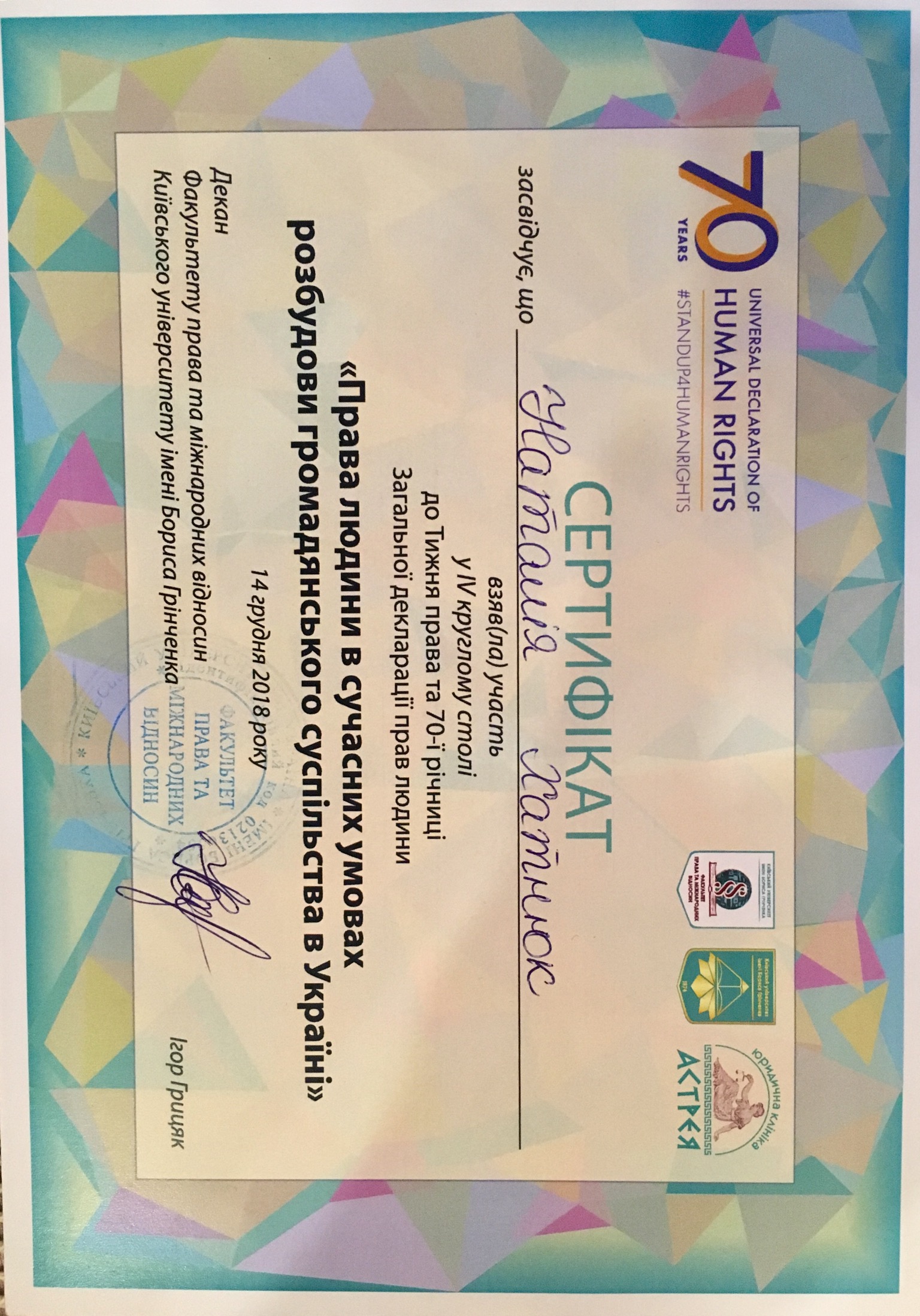 діяльності юридичних клінік для школярів середньої ланки загальноосвітніх шкіл» ) (Сертифікат від 19 листопада 2019 року, загальна кількість 30 годин);