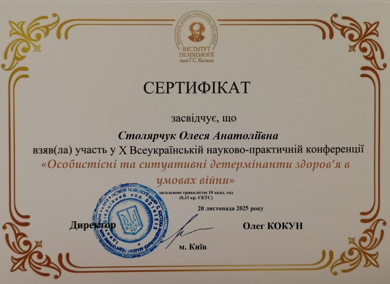 | 12528 | Особистісні та ситуативні детермінанти здоров’я в умовах війни | Прояви позиції жертви у партнерок загиблих військовослужбовців | Київ |