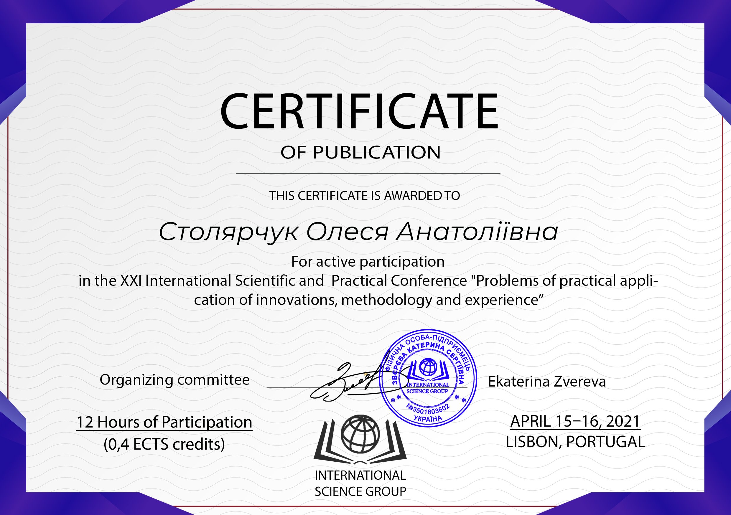 | ID | Назва | Тема доповіді | Місце проведення | Документ, що засвідчує | Дата проведення |