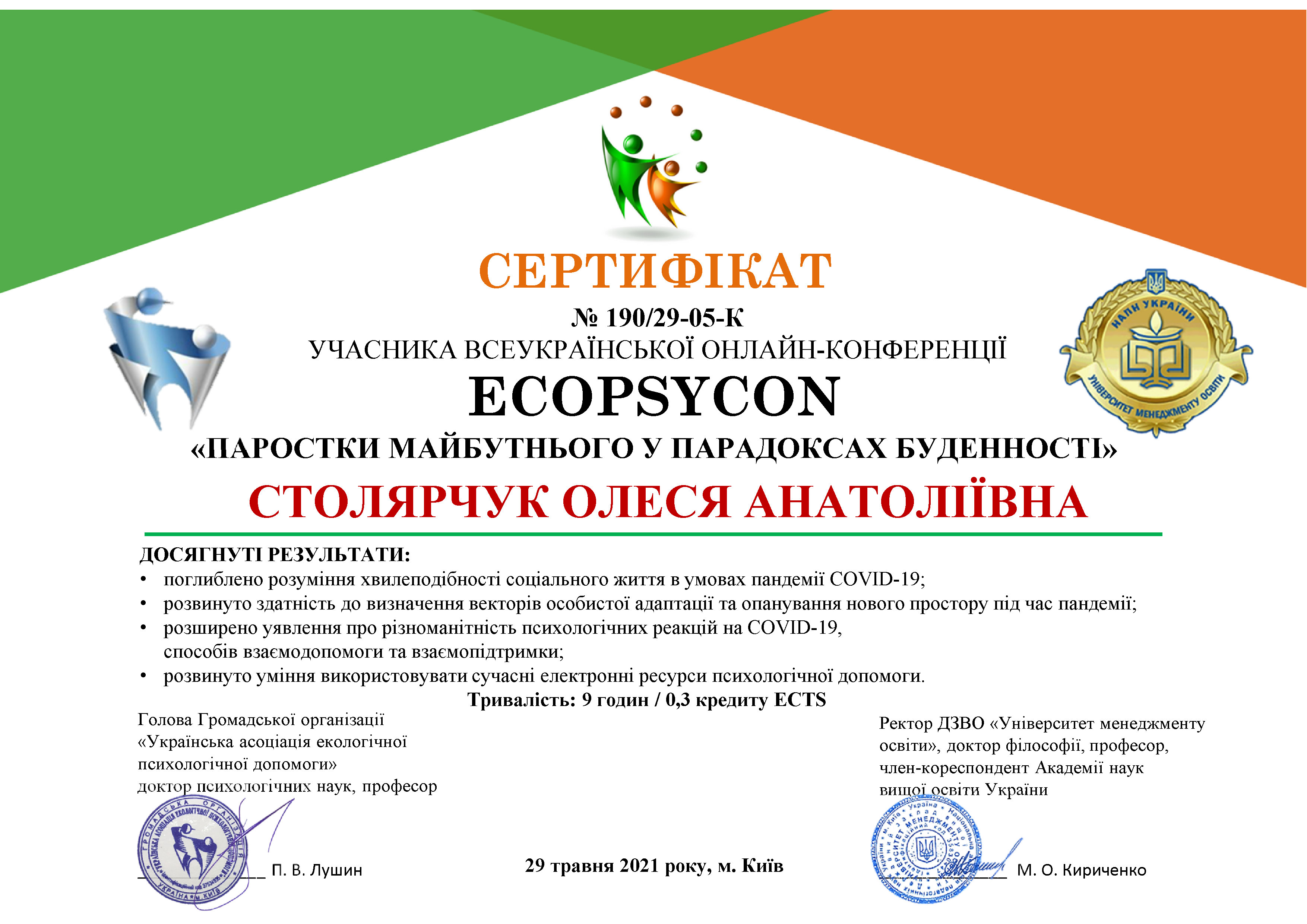 | 6904 | ECOPSYCON-2021 "Паростки майбутнього у парадоксах буденності | Переваги та ризики особистісного зростання в умовах соціальної невизначеності | Київ |