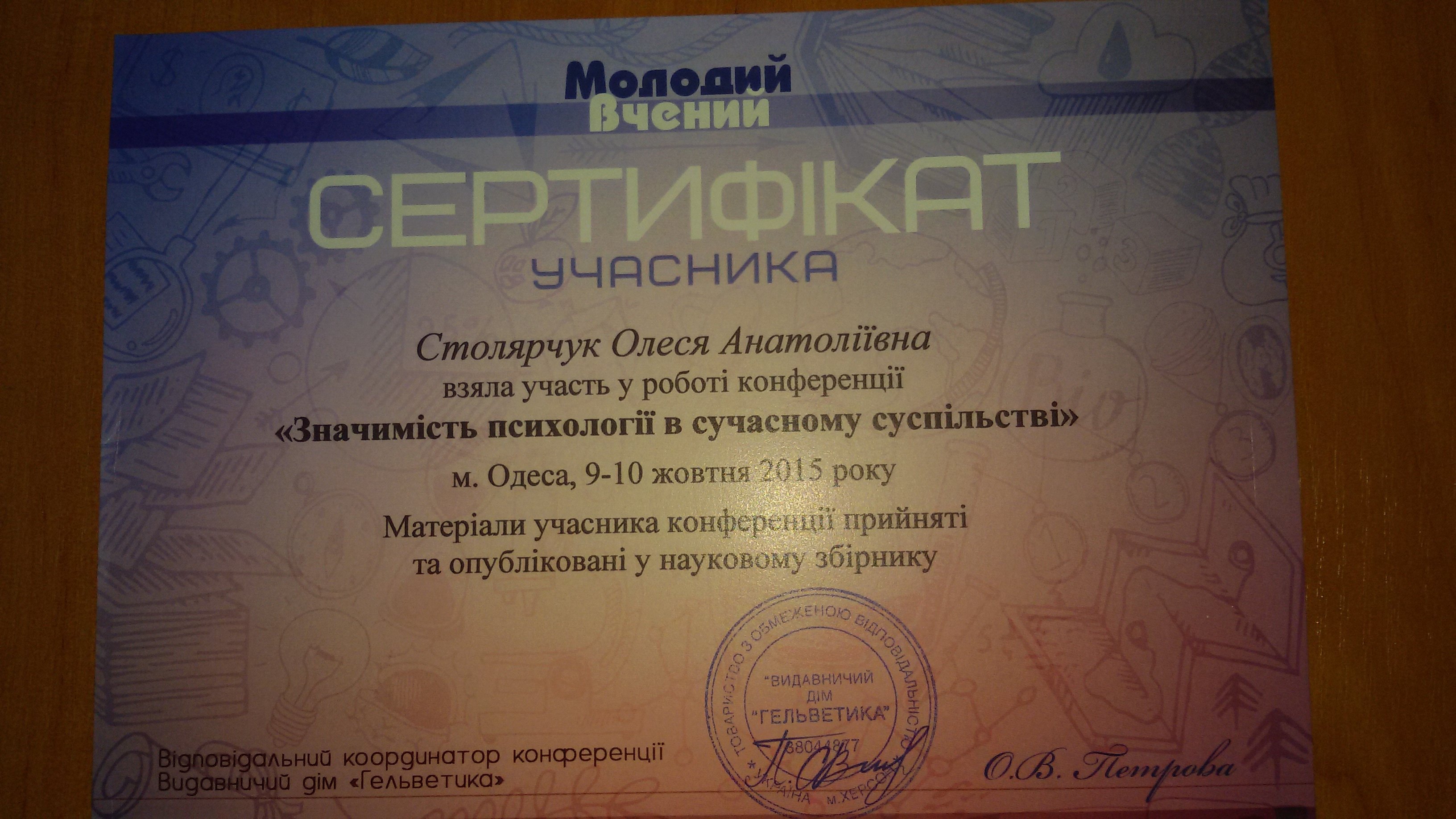 | 747 | Значимість психології в сучасному суспільстві | Суб'єктність особистості студента як умова формування його професійного універсуму | Одеса |