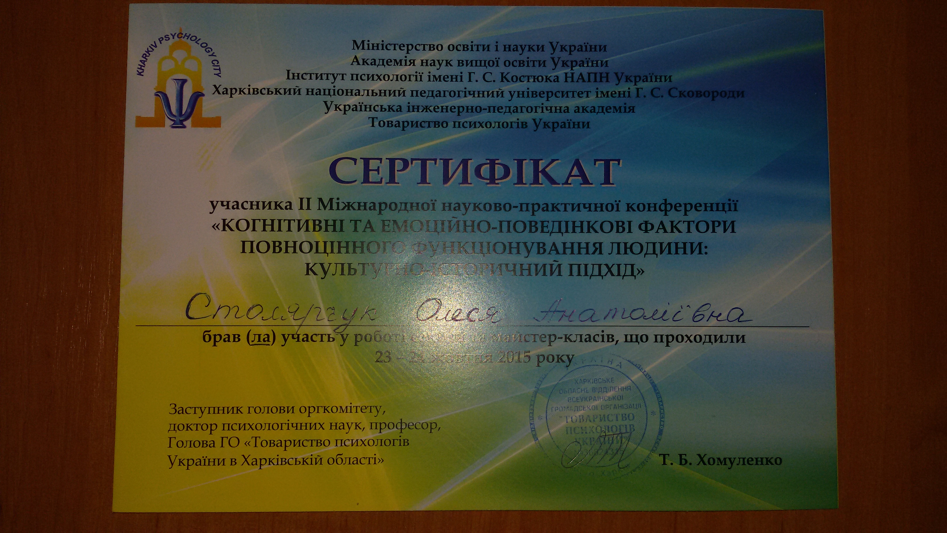 | 748 | ІІ Міжнародна науково-практична конференція 'Когнітивні та емоційно-поведінкові фактори повноцінного функціонування людини: культурно-історичний підхід' | Роль самосвідомості майбутнього фахівця у формуванні його професійного універсуму | Україна, Харків |