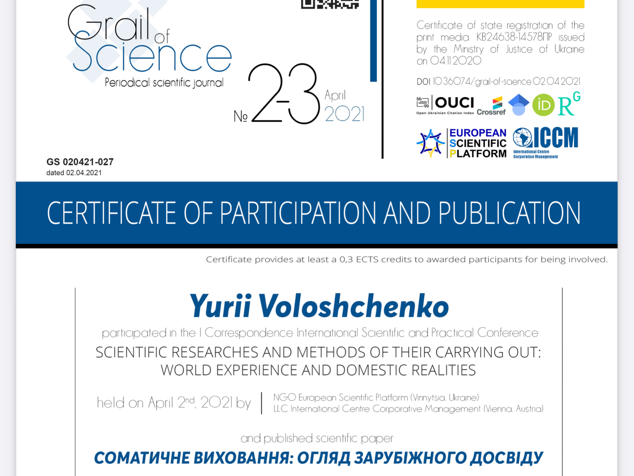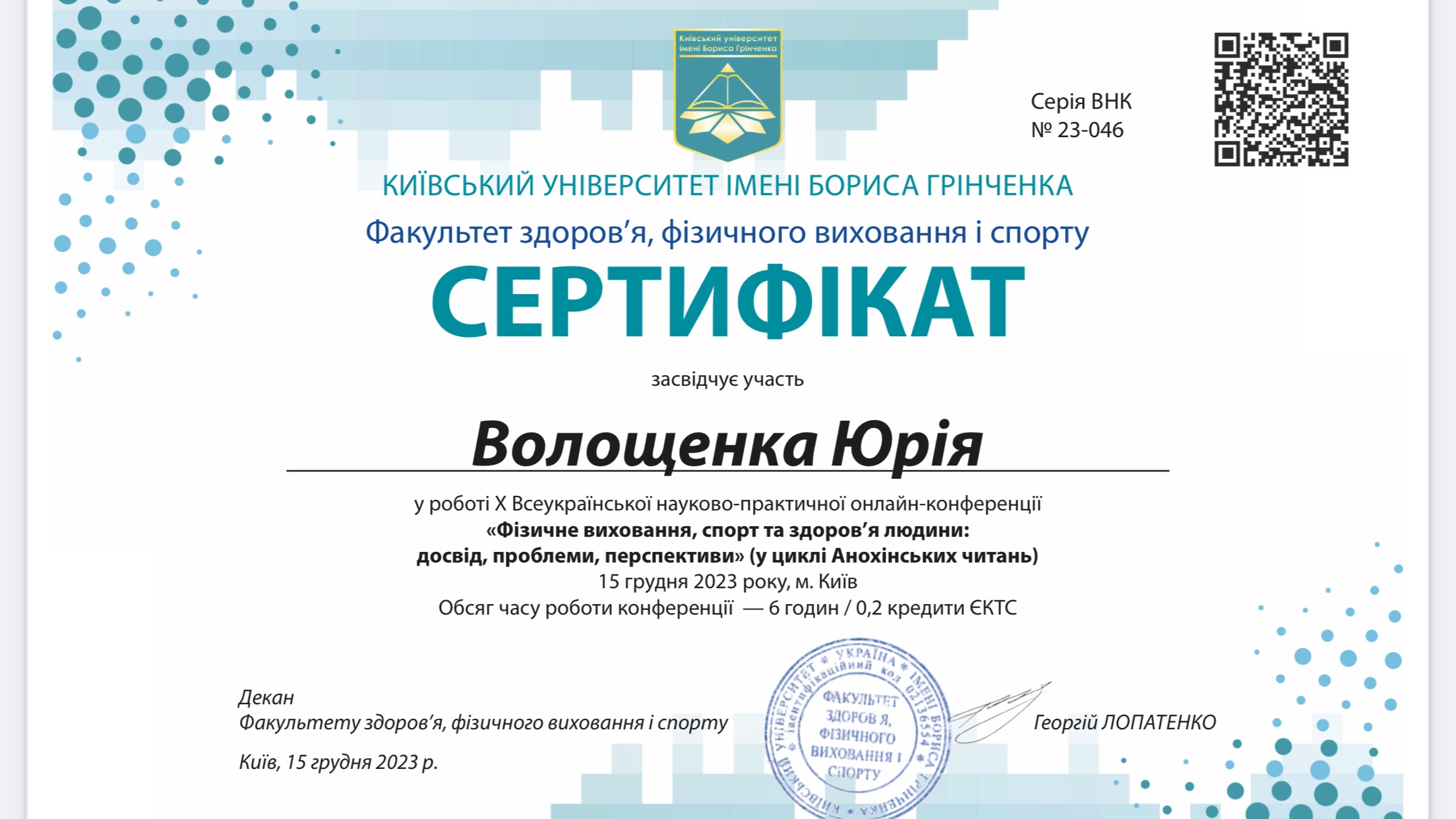 | 4225 | International Scientific and Practical Conference HEALTH, PHYSICAL EDUCATION AND SPORT: PERSPECTIVES AND BEST PRACTICES | Somatics in the work with students of special medical groups | Kyiv, Borys Grinchenko Kyiv University |