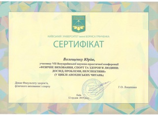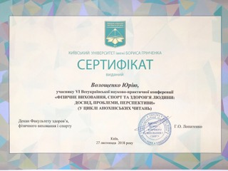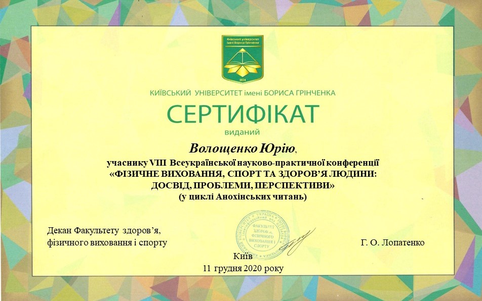 | 3737 | VІ Всеукраїнська науково-практична конференція «ФІЗИЧНЕ ВИХОВАННЯ, СПОРТ ТА ЗДОРОВ’Я ЛЮДИНИ: ДОСВІД, ПРОБЛЕМИ, ПЕРСПЕКТИВИ» (У ЦИКЛІ АНОХІНСЬКИХ ЧИТАНЬ) | учасник конференції | м. Київ, Київський університет імені Бориса Грінченка |