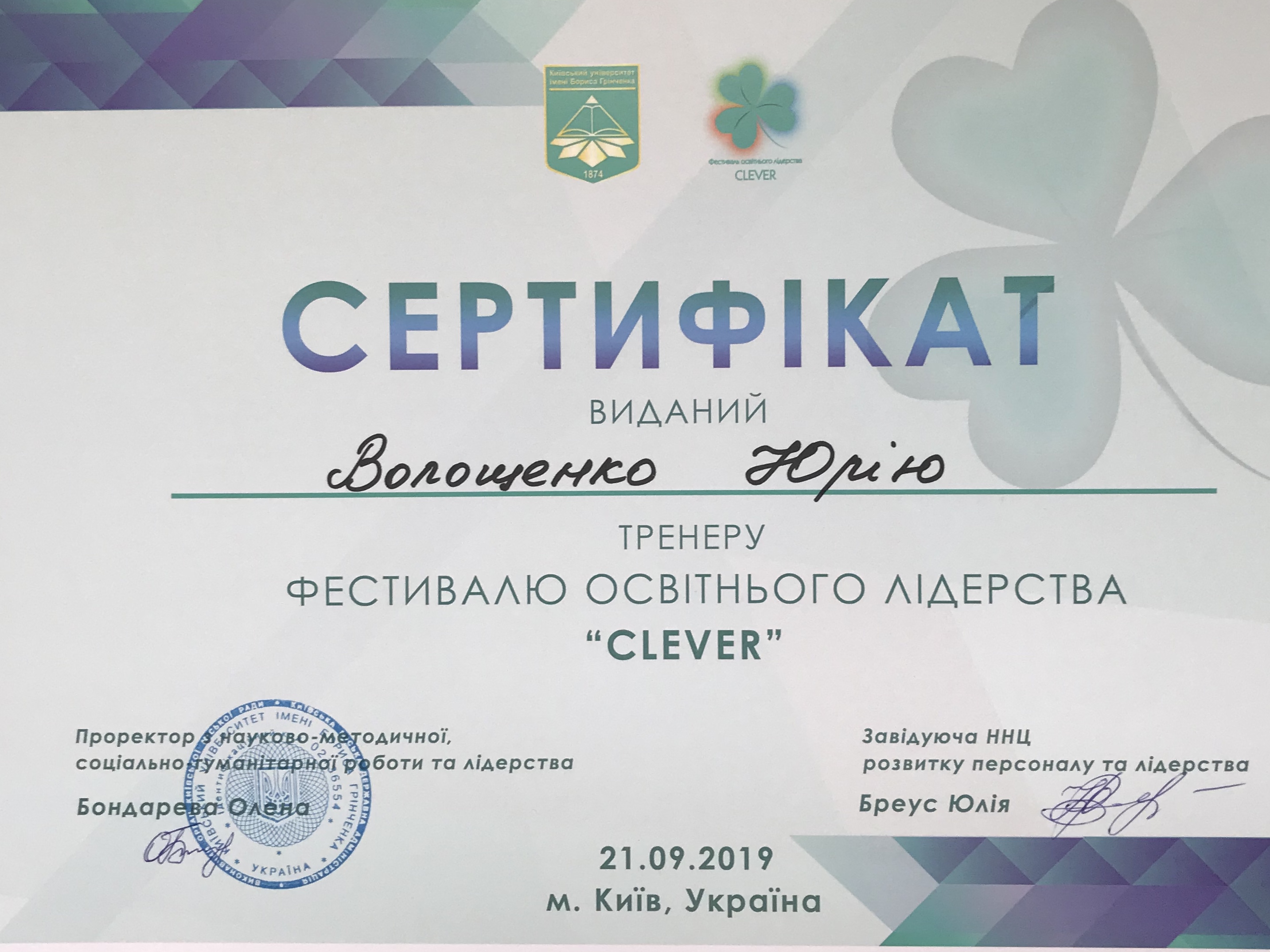 | 4344 | Фестиваль освітнього лідерства "CLEVER" | Соматичний підхід в роботі з власним тілом | м. Київ, Київський університет імені Бориса Грінченка |