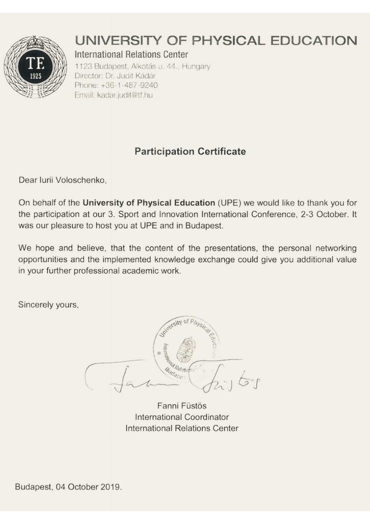| 4377 | 3. Sport and Innovation International Conference | A somatic approach to teaching students of special medical group at Borys Grinchenko Kyiv University | University of Physical Education, Budapest, Hungary |