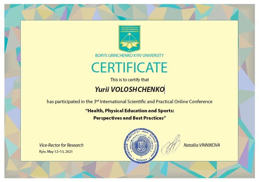 | 6771 | 3rd International Scientific and Practical Online Conference HEALTH, PHYSICAL EDUCATION AND SPORT: PERSPECTIVES AND BEST PRACTICES | Сучасні методи дослідження в галузі соматичного виховання | Kyiv, Borys Grinchenko Kyiv University |