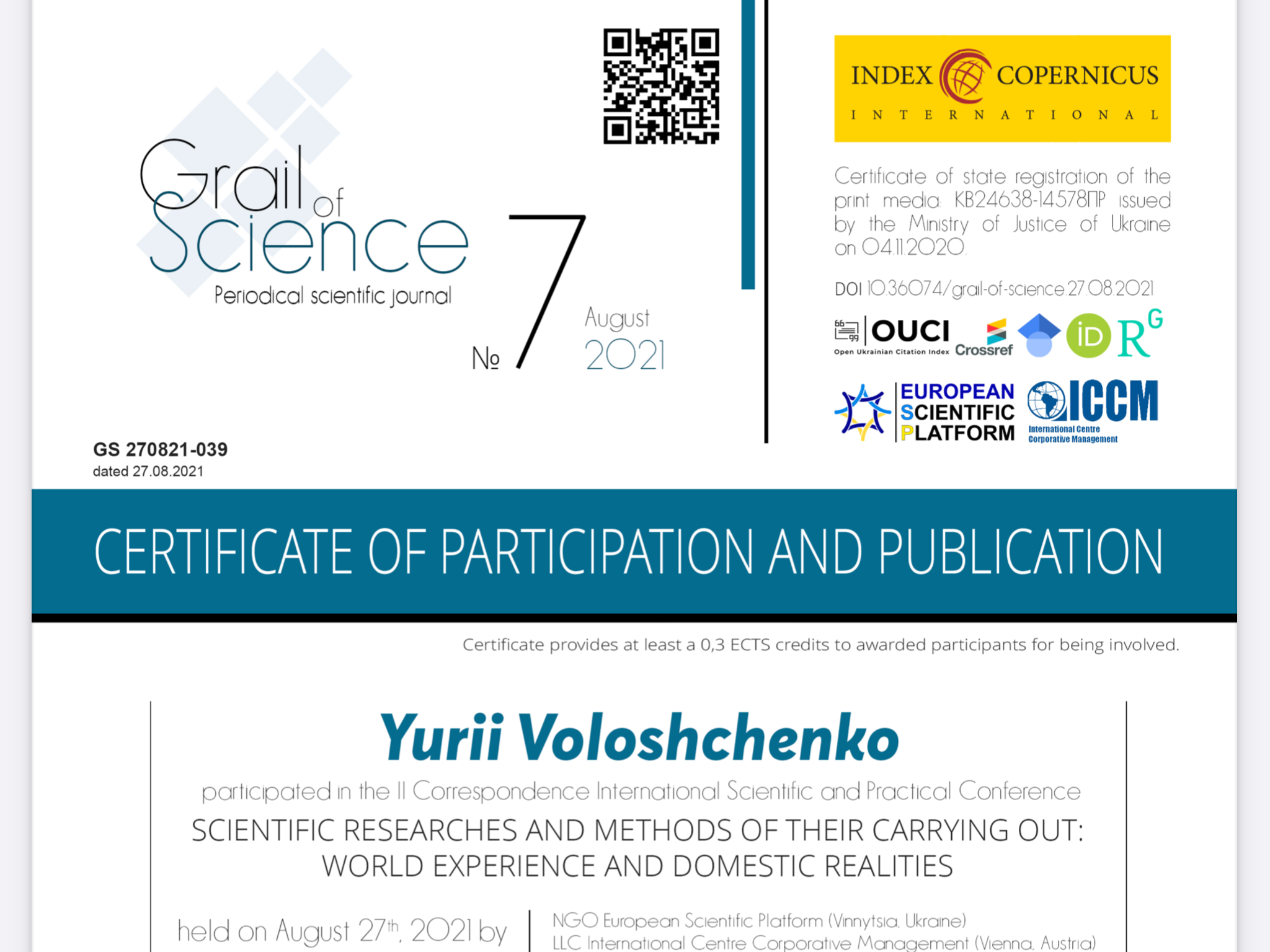 | 7022 | II Correspondence International Scientific and Practical Conference «SCIENTIFIC RESEARCHES AND METHODS OF THEIR CARRYING OUT: WORLD EXPERIENCE AND DOMESTIC REALITIES» | Соматичне виховання: оцінка "інтероцептивного усвідомлення" | Вінниця, UKR - Відень, AUT |