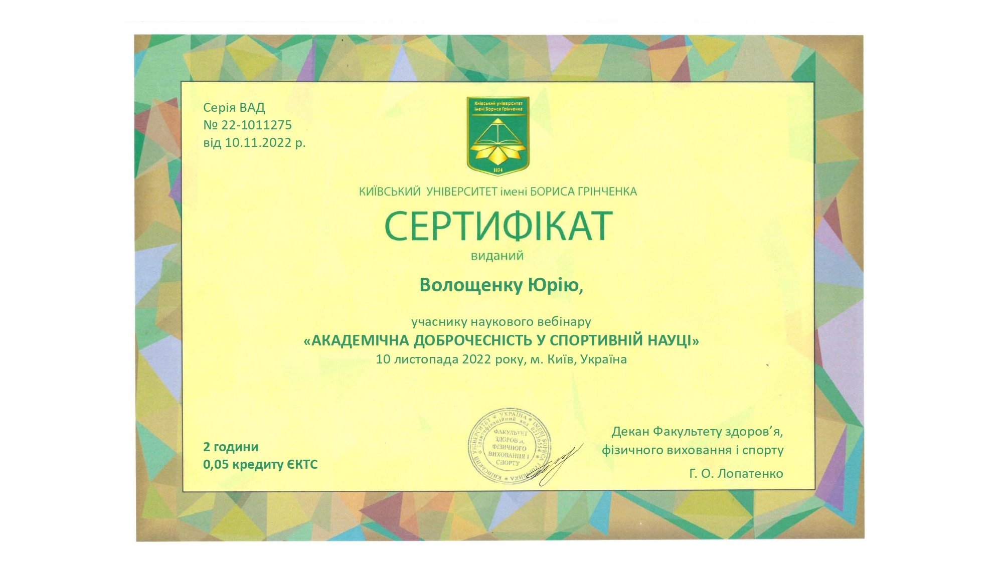 | 7694 | Науковий вебінар "АКАДЕМІЧНА ДОБРОЧЕСНІСТЬ У СПОРТИВНІЙ НАУЦІ" | учасник | м. Київ, Київський університет імені Бориса Грінченка |