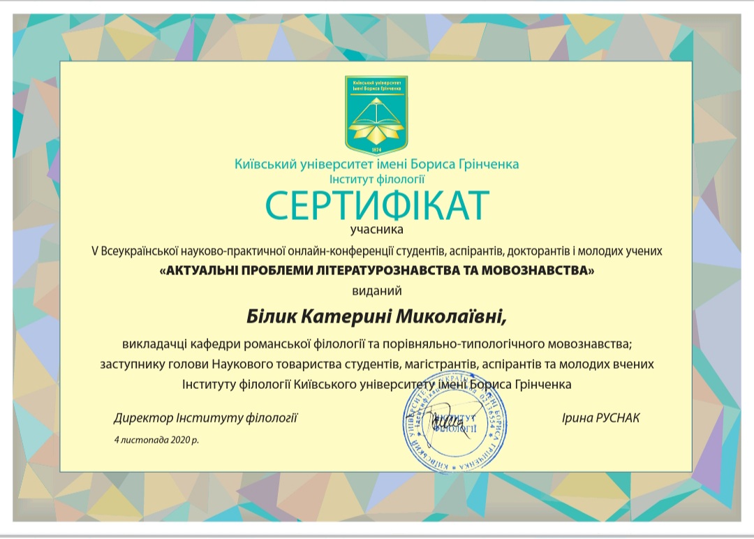 | 4957 | ІІ Всеукраїнська науково-практична конференція "Актуальні проблеми літературознавства та мовознавства" | «Структурно-семантичні особливості текстів жанру «надзвичайні події» у французькому медіадискурсі» | Київський університет імені Бориса Грінченка | document.pdf | |