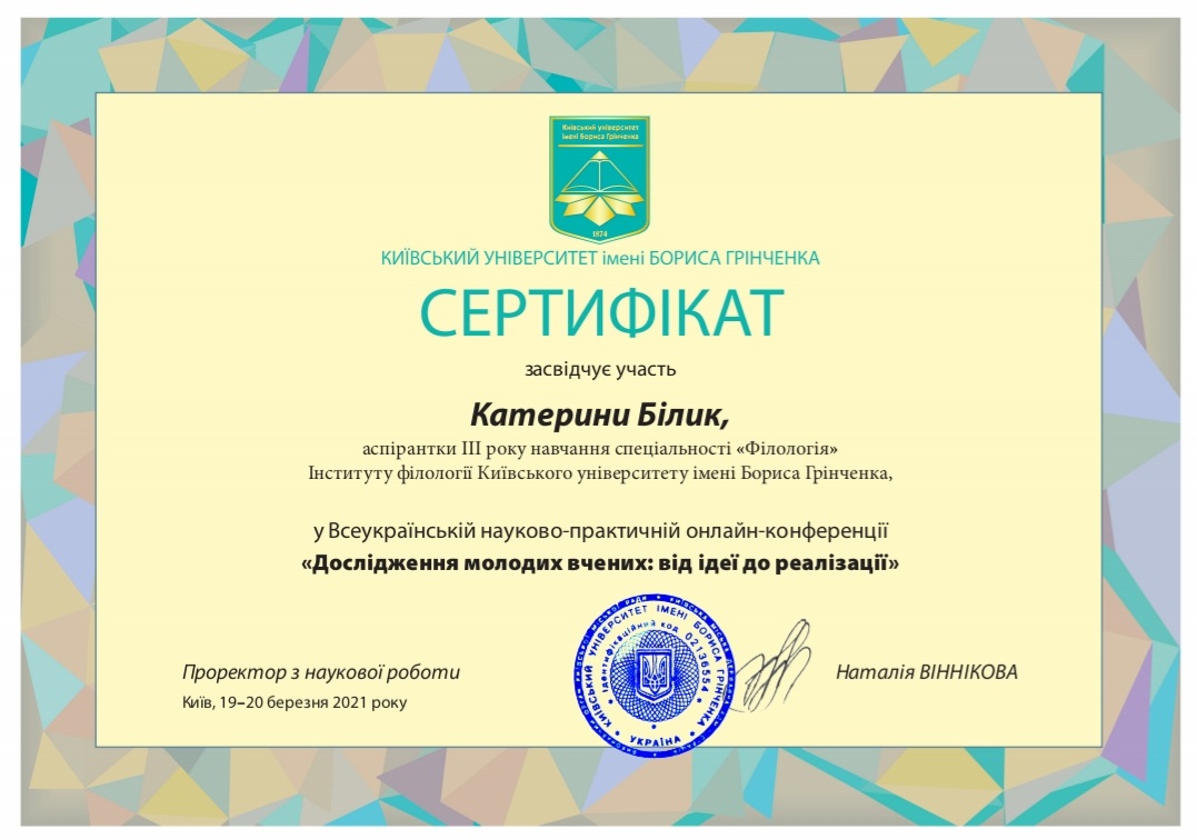 | 10496 | Всеукраїнська науково-практична онлайн-конференція «ДОСЛІДЖЕННЯ МОЛОДИХ ВЧЕНИХ: ВІД ІДЕЇ ДО РЕАЛІЗАЦІЇ» | - | Київський столичний університет імені Бориса Грінченка | document.pdf | |