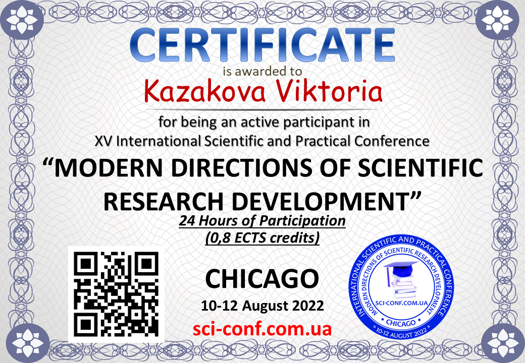| 8261 | The 15th International scientific and practical conference “Modern directions of scientific research development” | ВОЄННІ (ВІЙСЬКОВІ) ОБЛІГАЦІЇ: ПОНЯТТЯ І ОСОБЛИВОСТІ РОЗМІЩЕННЯ В УМОВАХ ВОЄННОГО СТАНУ | Chicago, USA |