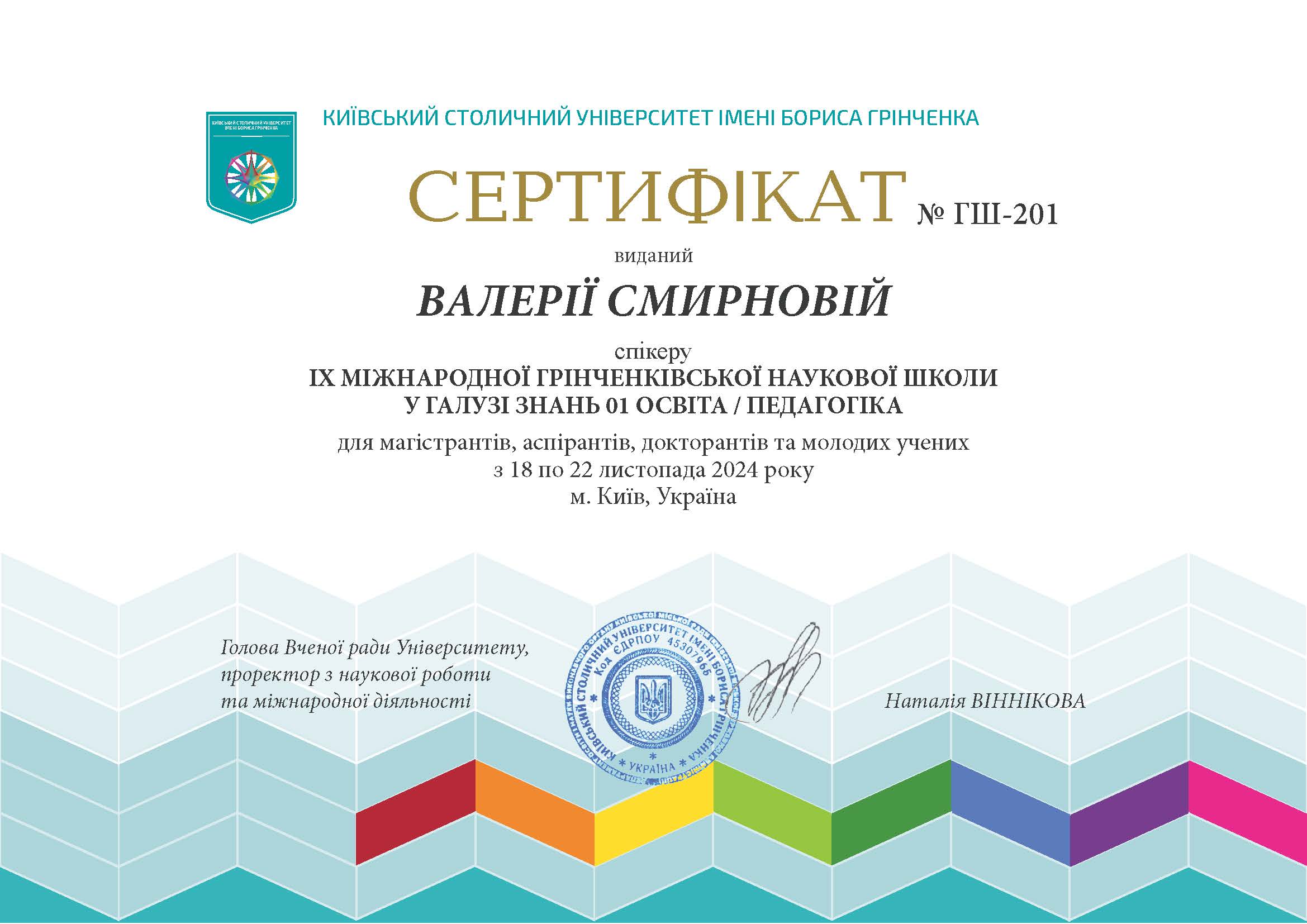 | 115 | Буйницька Оксана Петрівна, доктор педагогічних наук, професор, завідувач НДЛ цифровізації освіти Київського столичного університету імені Бориса Грінченка | «Проєктування інформаційно-аналітичної системи моніторингу дослідницької діяльності науково-педагогічних працівників закладів вищої освіти» / спеціальність 011 Освітні, педагогічні науки | навчалась в аспірантурі Університету Грінченка на освітньо-науковій програмі «Освітні, педагогічні науки» (спеціальність 011 Освітні, педагогічні науки, галузь знань 01 Освіта/Педагогіка) | Київський столичний університет імені Бориса Грінченка | Диплом_Смірнова.pdf | 2024 |