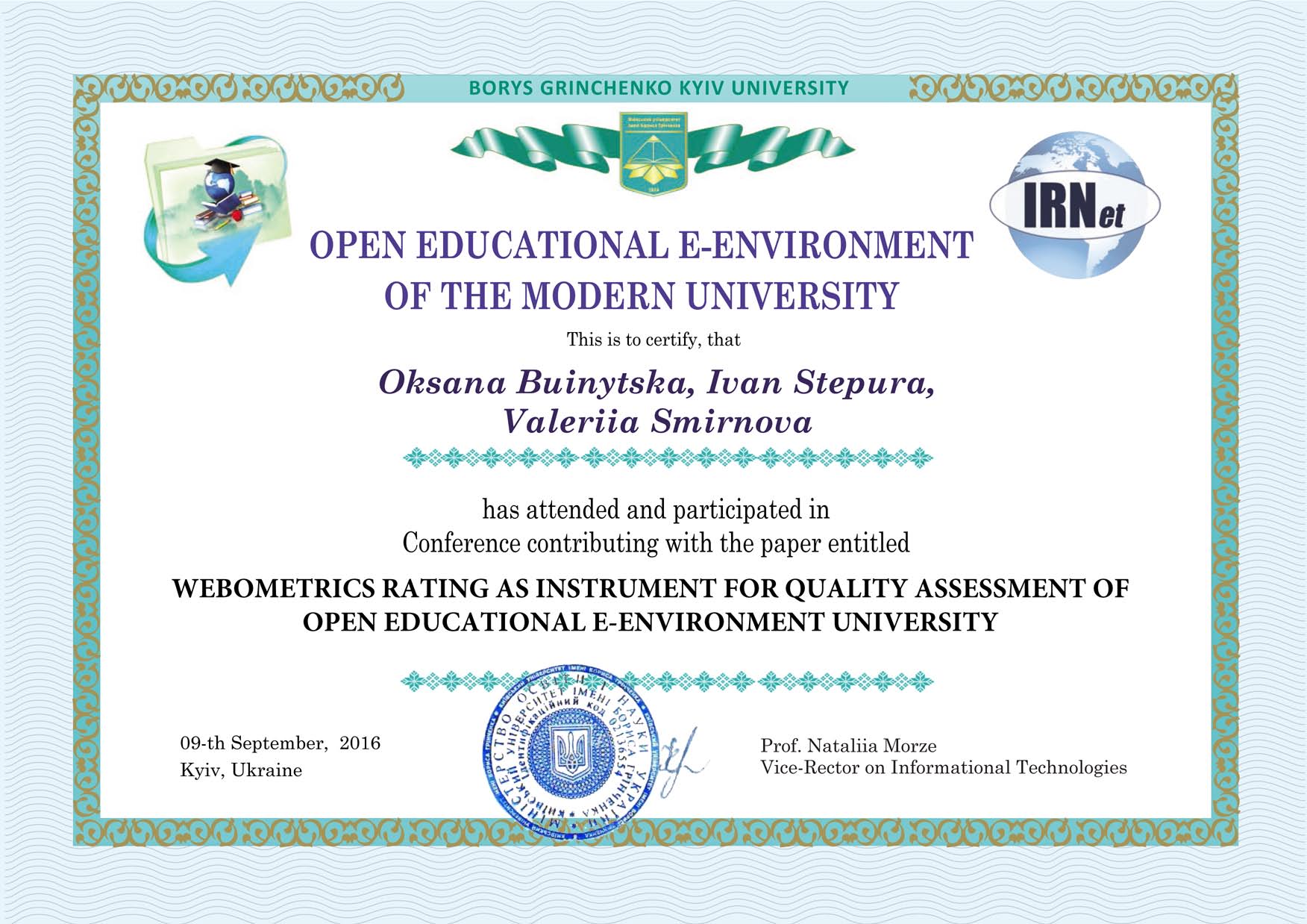 | 1401 | Open educational e-environment of the modern university: International scientific conference | Webometrics Rating as Instrument for quality assessment of open Educational E-environment University | Kyiv |