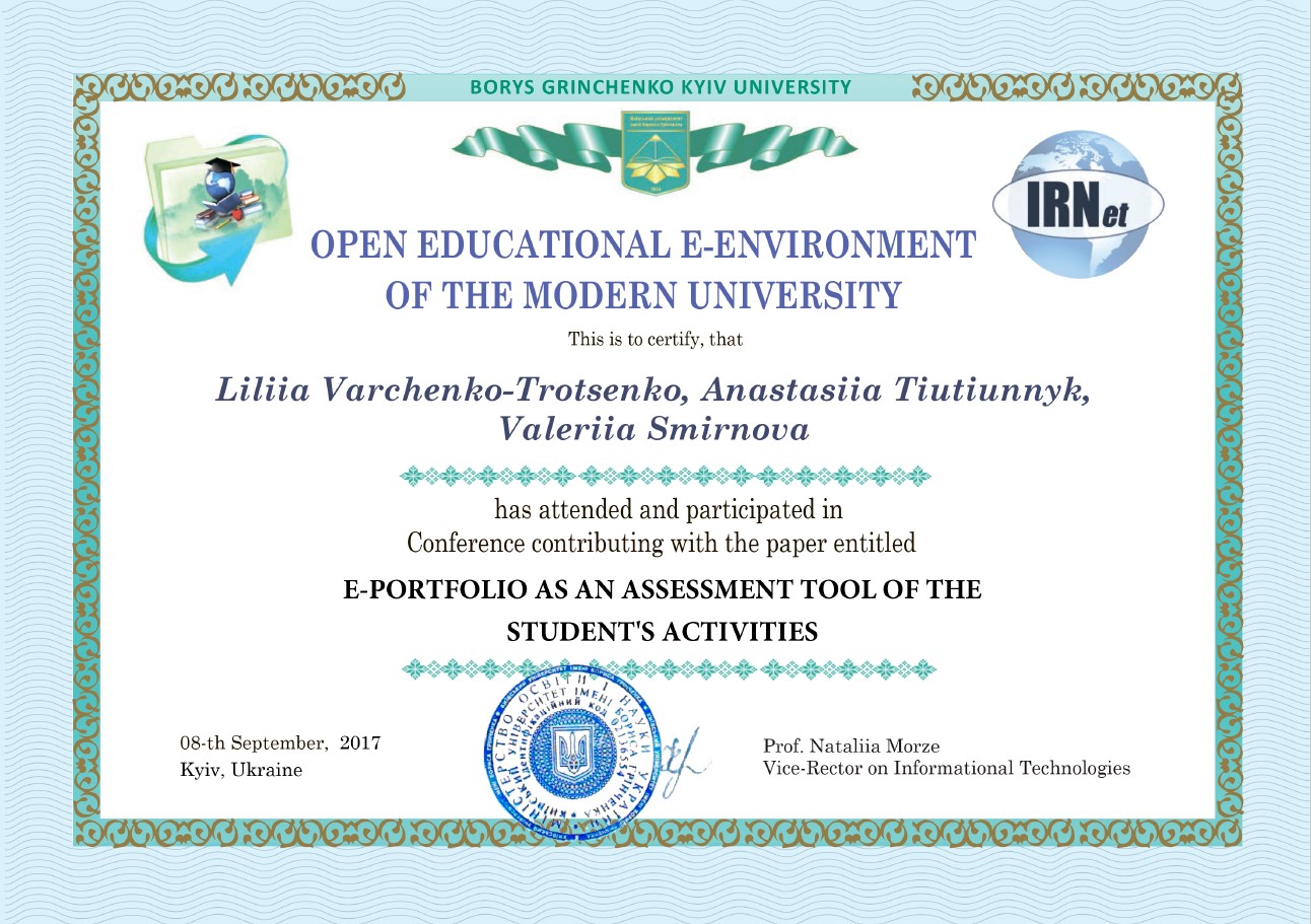 | 1791 | III Міжнародна науково-практична конференція | E-portfolio as an assessment tool of the student's activities | м. Київ |