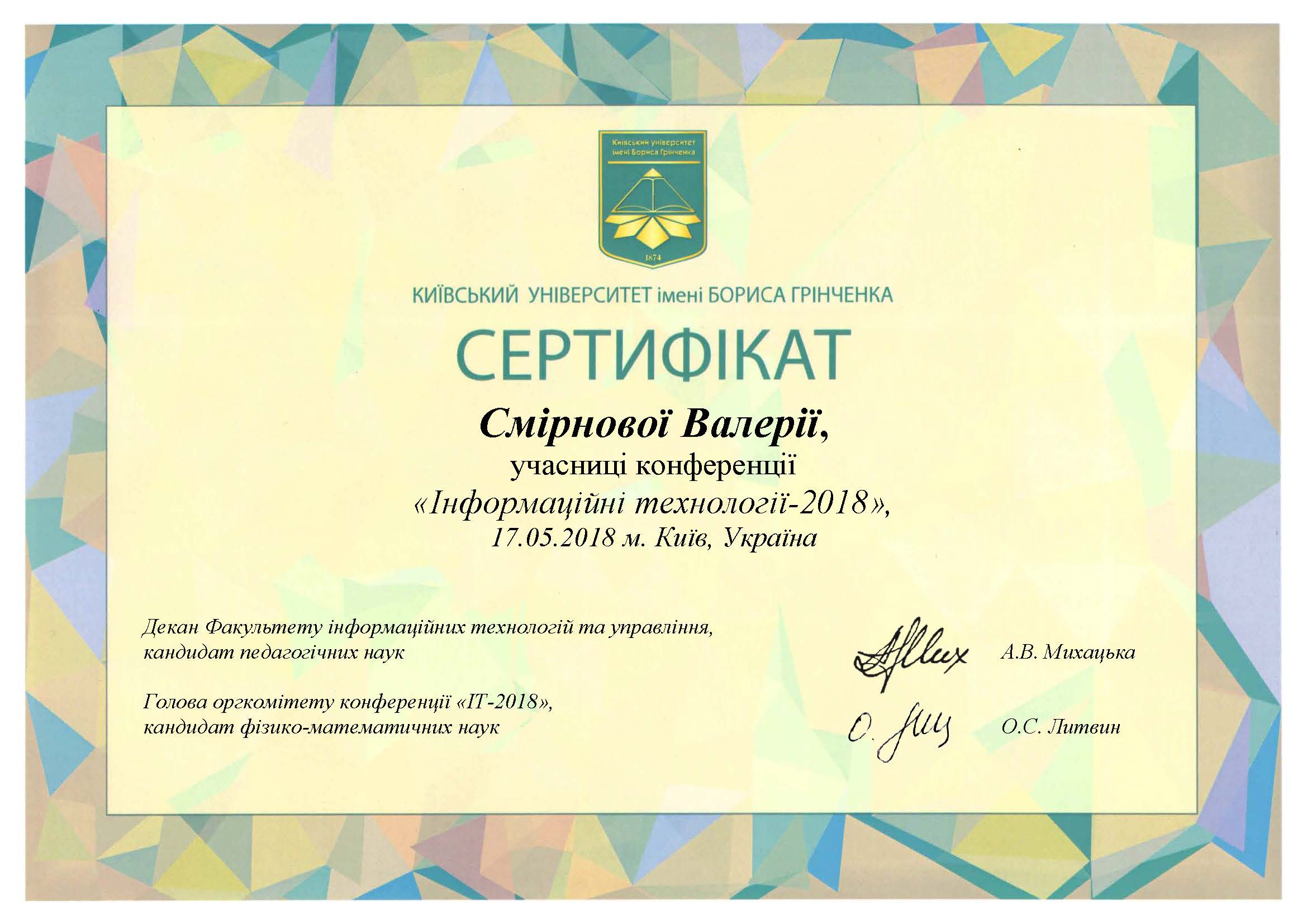 2018 р. - диплом магістра з відзнакою Київського університету імені Бориса Грінченка, спеціальність «Комп’ютерні науки та інформаційні технології»