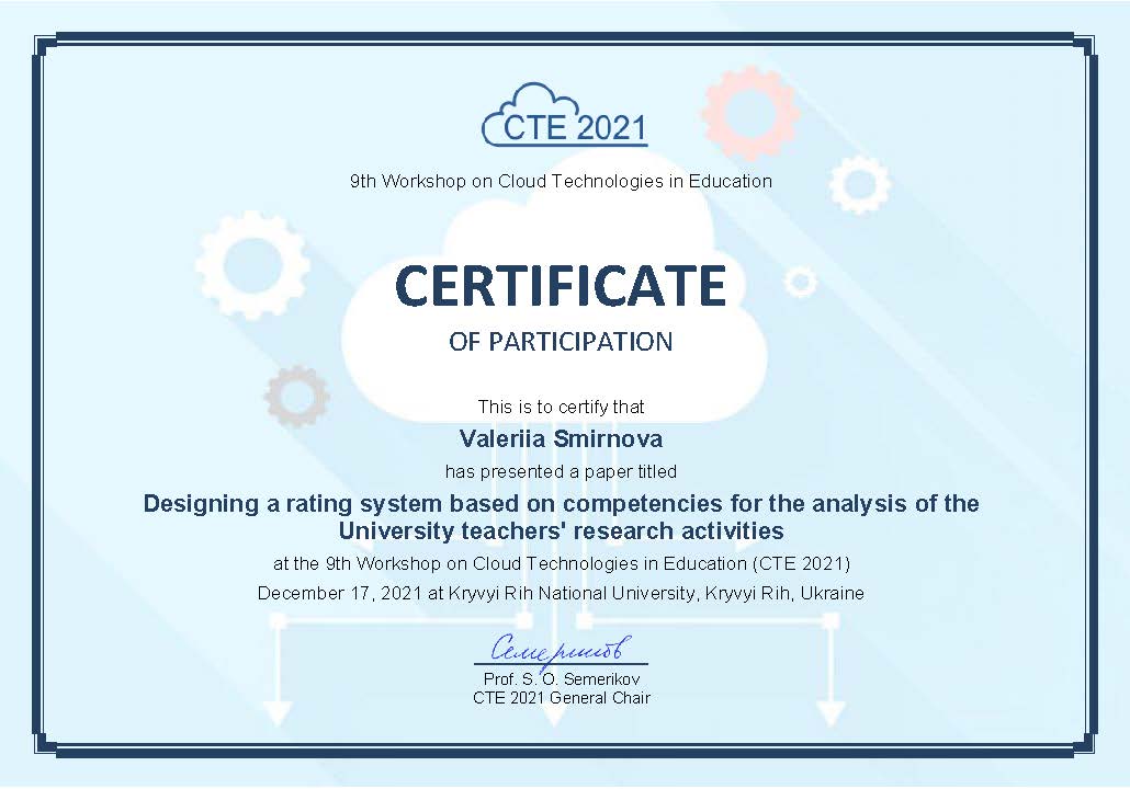 | 7837 | 9th International Workshop “Cloud Technologies in Education – 2021” | Designing a rating system based on competencies for the analysis of the University teachers’ research activities | Kryvyi Rih State Pedagogical University |
