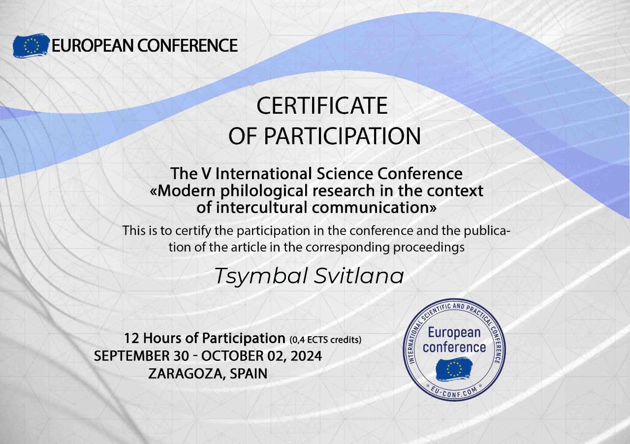 | 10728 | V Міжнародна науково-практична конференція «Modern philological research in the context of intercultural communication» | -- | Zaragoza, Spain |