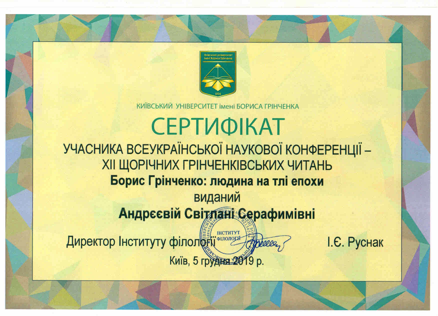 | 5016 | Всеукраїнська наукова конференція ХІІ щорічні Грінченківські читання: Борис Грінченко людина на тлі епохи | Історичні взаємини українського та кримськотатарського народів у рецепції Б. Грінченка (на прикладі художніх та народопросвітніх праць) | м. Київ |
