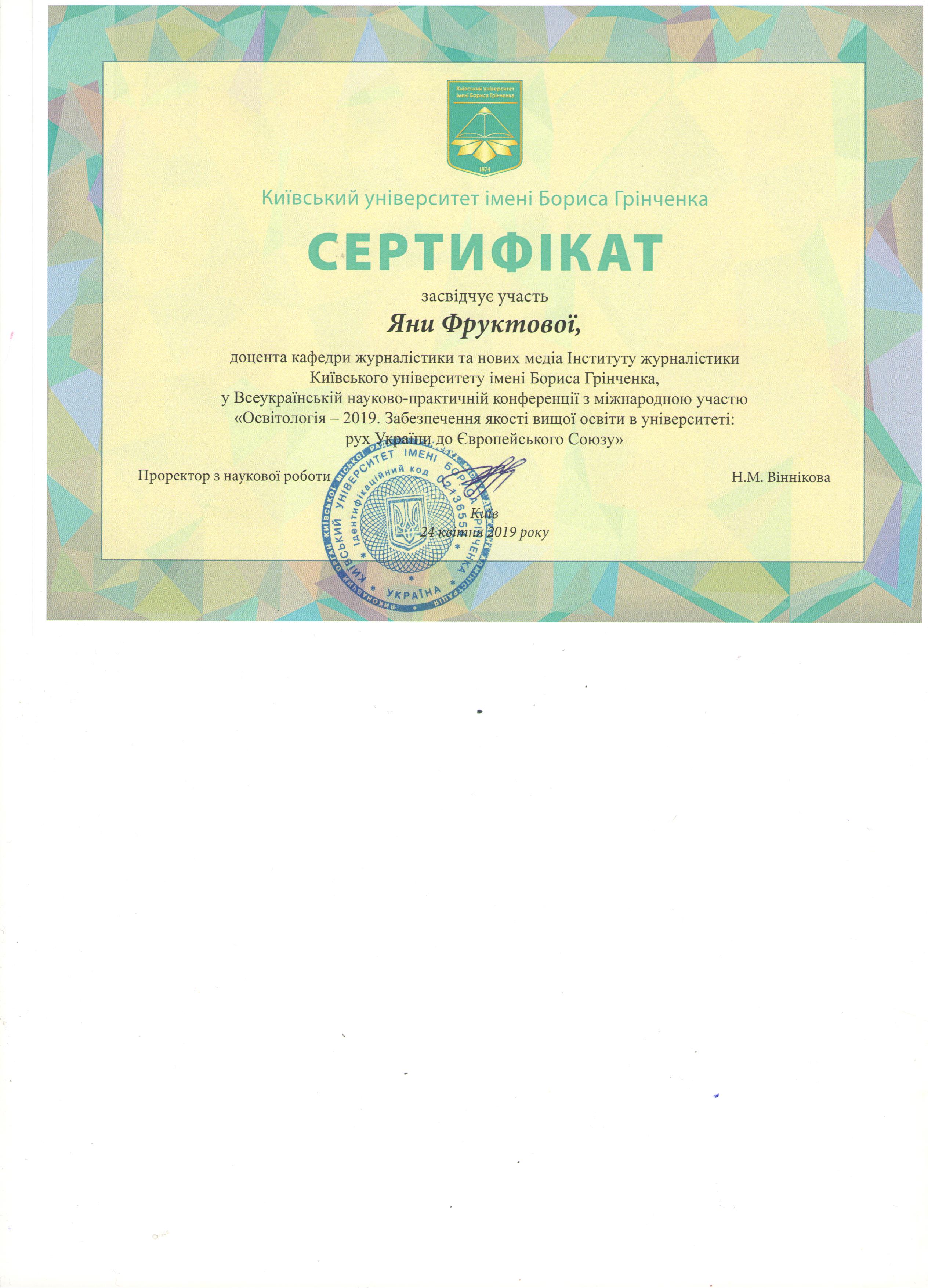 | 4872 | Освітологія-2019. Забезпечення якості вищої освіти в університеті: рух до України до Європейського союзу | Якість неформальної медіаосвіти | Київ |