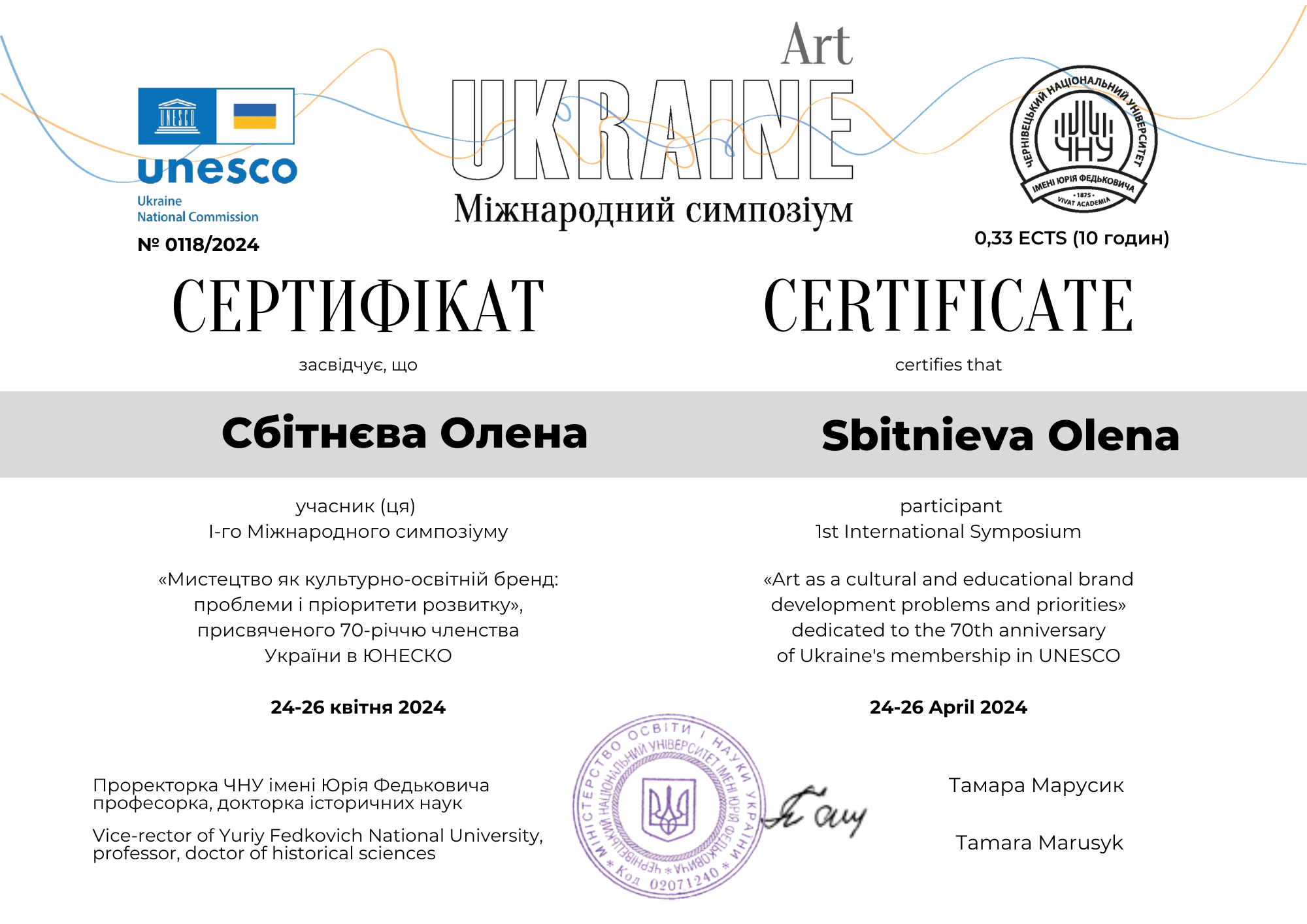 | 7429 | «ПРОБЛЕМИ ДУХОВНОГО ПРОБУДЖЕННЯ ОСОБИСТОСТІ: КУЛЬТУРА ТА ДУХОВНІ ЦІННОСТІ» в рамках міжнародного проекту Пола Д. Шафера «Епоха Культури» | Розвиток вокальної культури майбутніх вокалістів у процесі фахового навчання | м. Київ- м. Сєвєродонецьк |