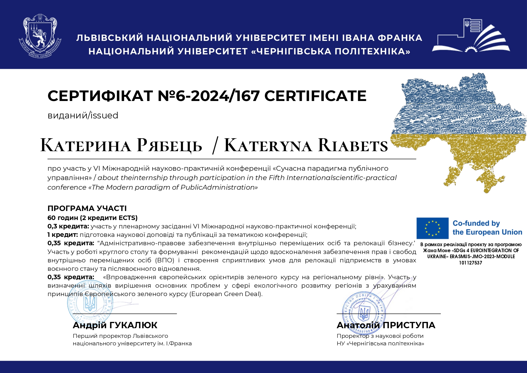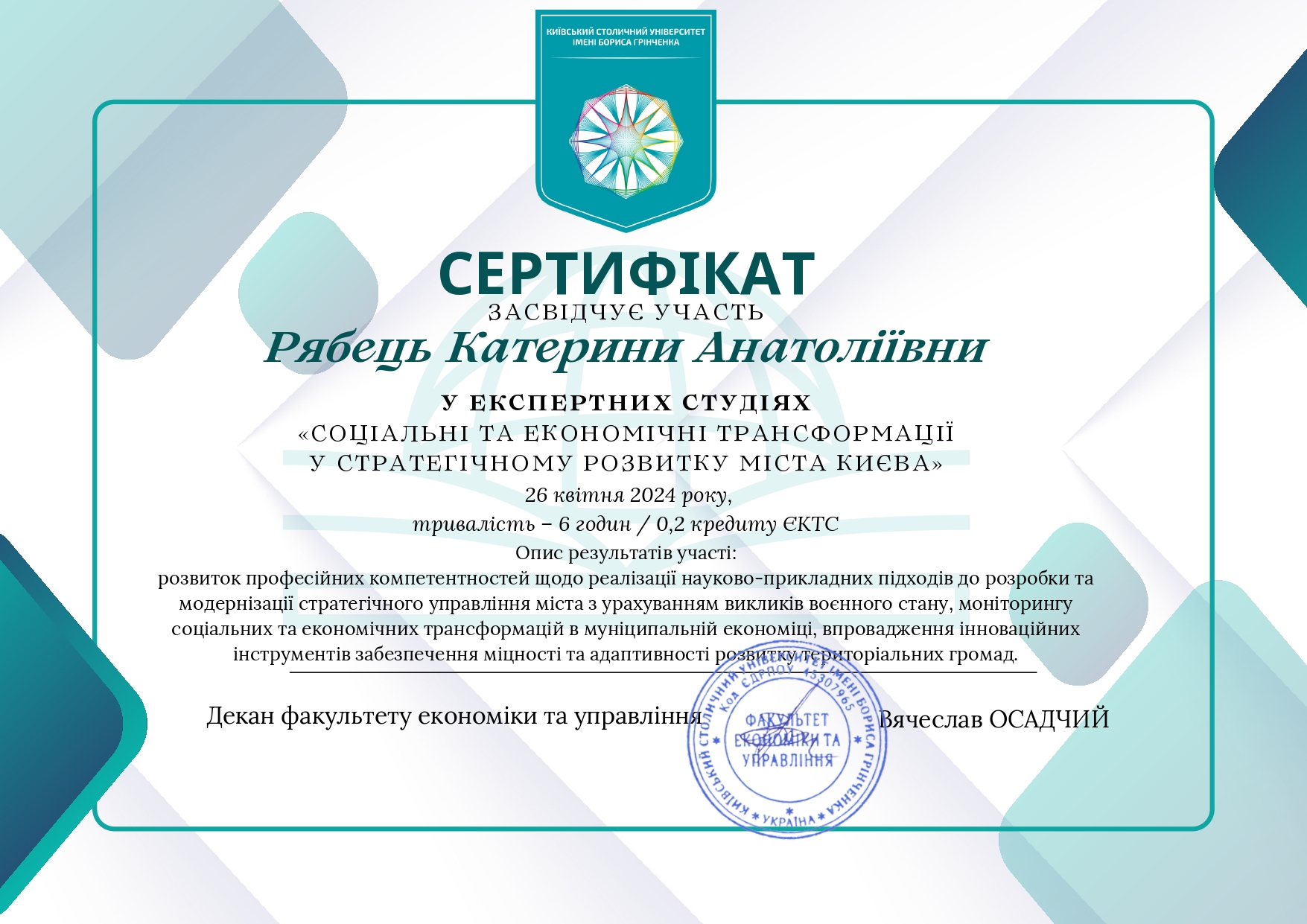 | 813 | Факультет економіки та управління | Кафедра управління | 124.3 | 1 | 2024 | https://www.researchgate.net/profile/Katerina-Riabets |