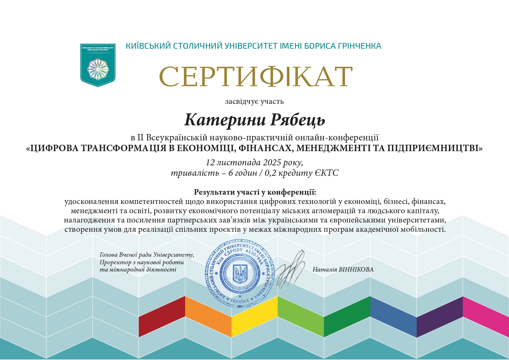 | 4 | Цифрова трансформація в економіці, фінансах, менеджменті та підприємництві | Факультет економіки та управління | Міжнародна науково-практична онлайн-конференція | Київський університет імені Бориса Грінченка | Член оргкомітету | 2023 |