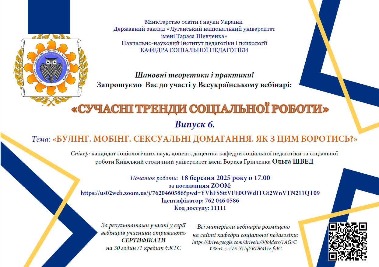 | 11717 | Сучасні тренди соціальної роботи | Булінг. Мобінг.Сексуальні домагання. Як з цим боротись? | онлайн |