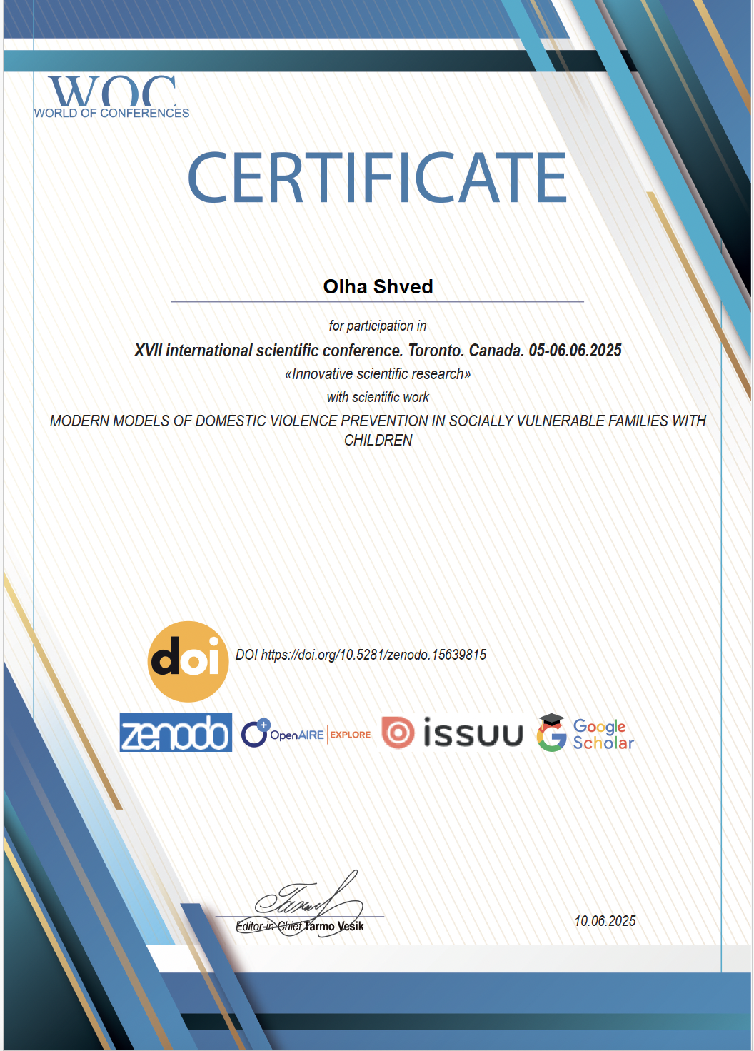 | 12030 | Innovative scientific research | Сучасні моделі профілактики домашнього насильства у соціально вразливих сім’ях з дітьми | Торонто. Канада |