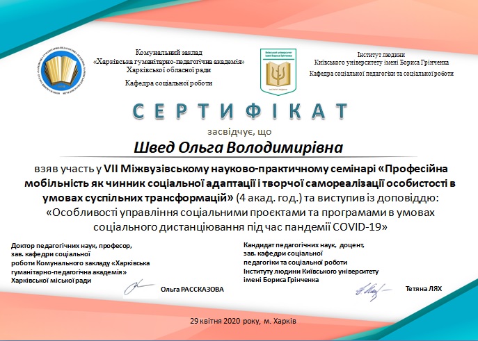 | 5596 | VII Міжвузівський науково-практичний семінар "Професійна мобільність як чинник соц.адаптації і творчої самореалізації" | Особливості управління соціальними проєктами та програмами в умовах соц.дистанціонування під час пандемії COVID-19 | Харків |