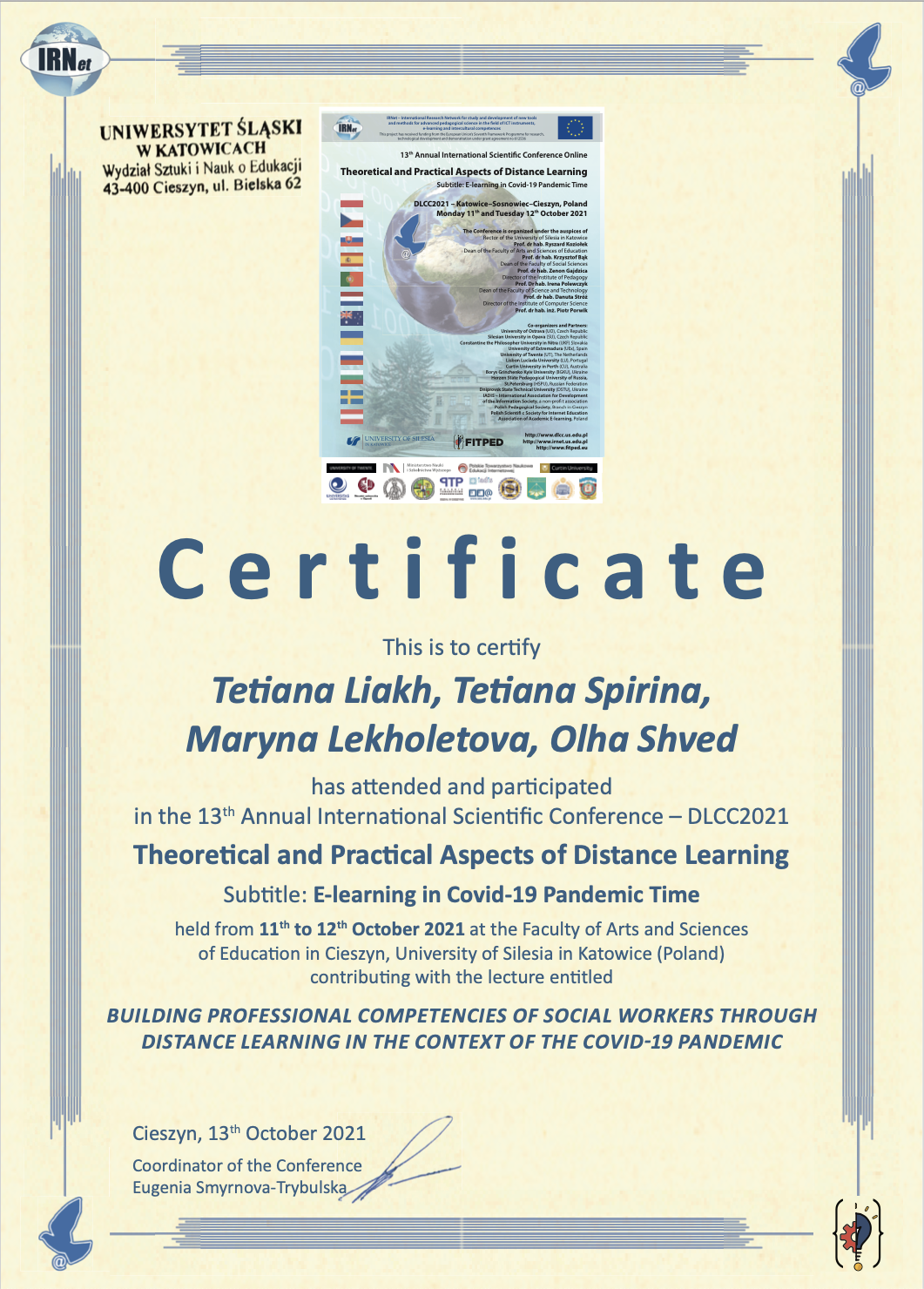 | 7111 | Theoretical and Practical Aspects of Distance Learning | Building Professional Competence of Social Workers through Distance Learning in the Context of COVID-19 | Poland, Katowice |