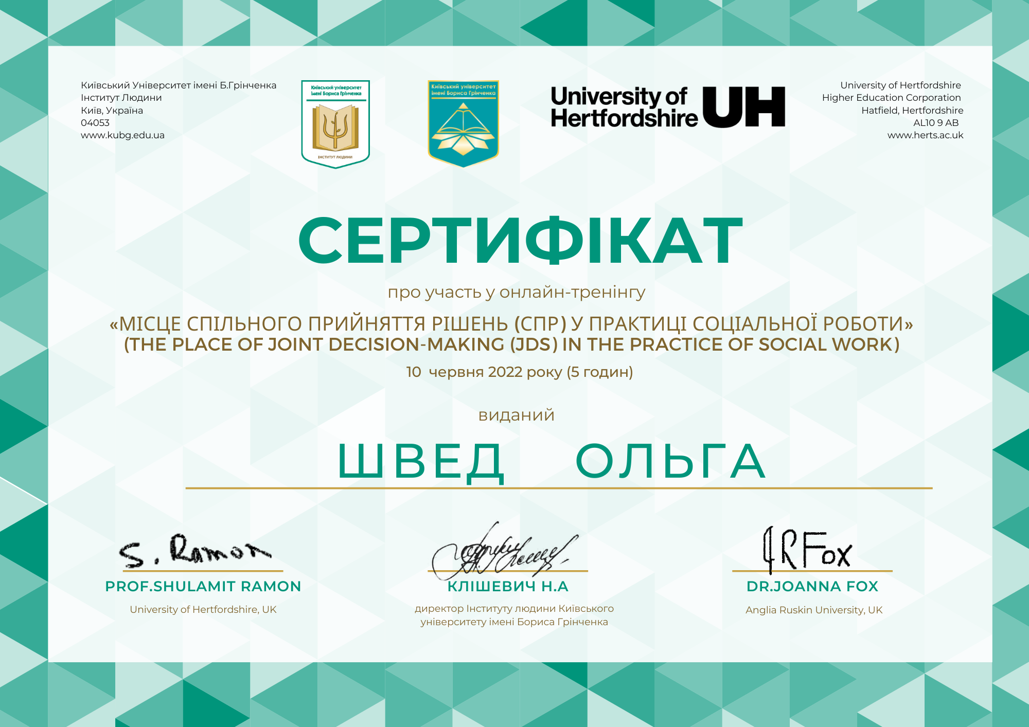| 8213 | Місце спільного прийняття рішень (СПР) у практиці соціальної роботи | організатор та учасниця тренінгу | онлайн |