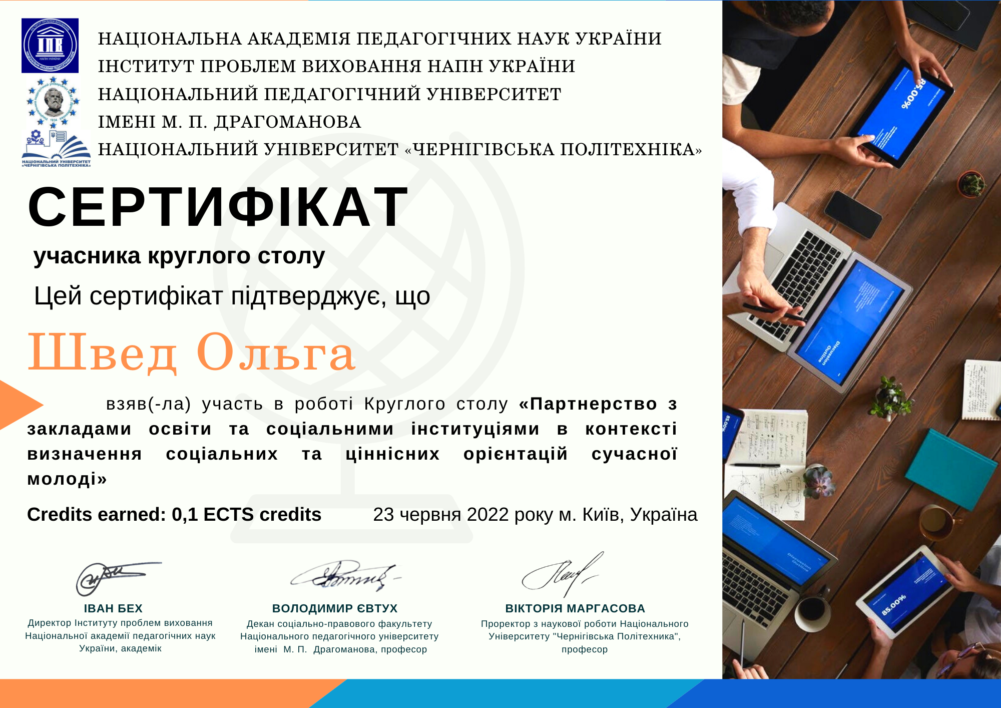 | 8239 | Круглий стіл "Партнерство з закладами освіти та соціальними інституціями в контексті визначення соціальних та ціннісних орієнтацій сцчасної молоді" | участь в обговоренні | Київ |