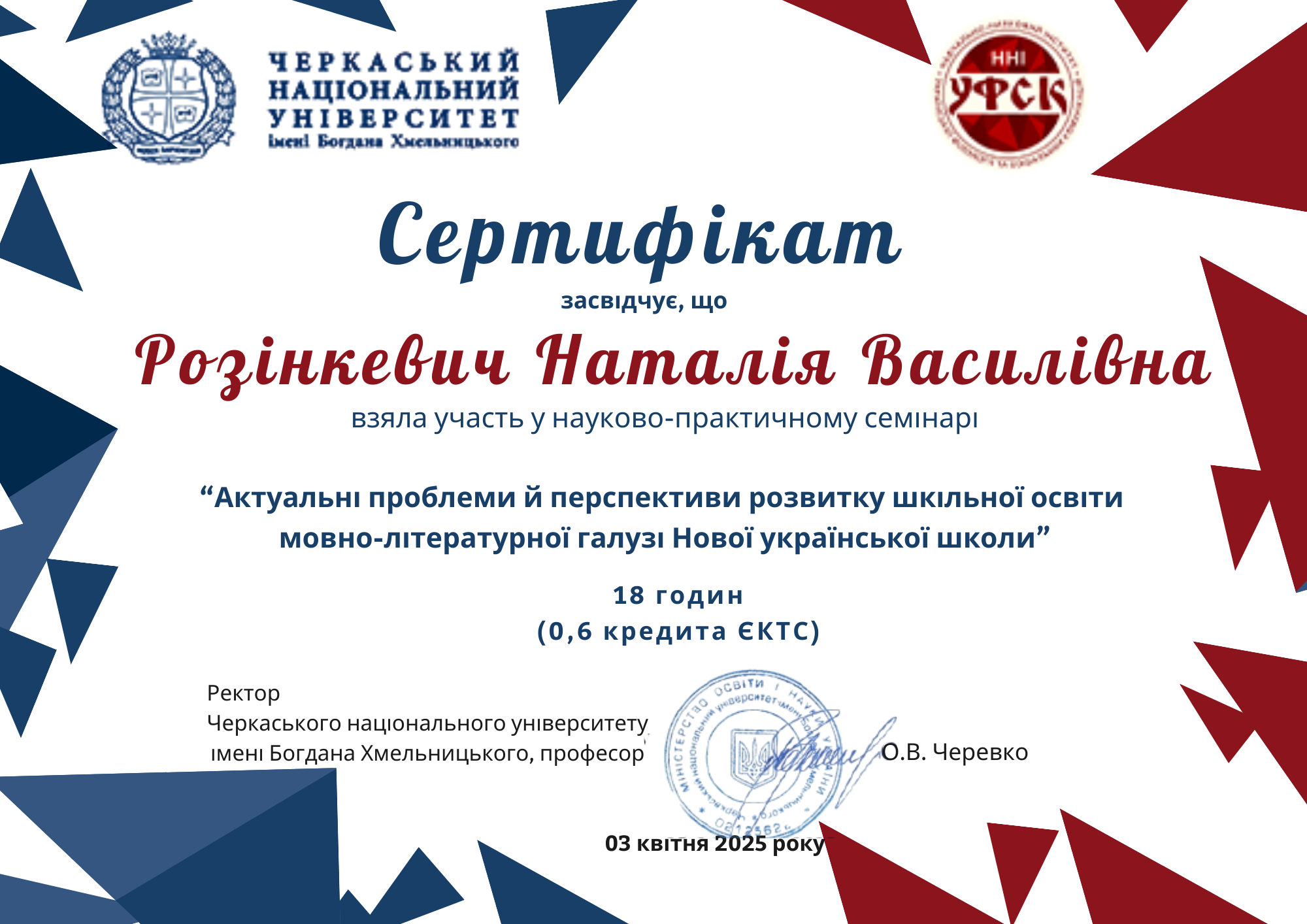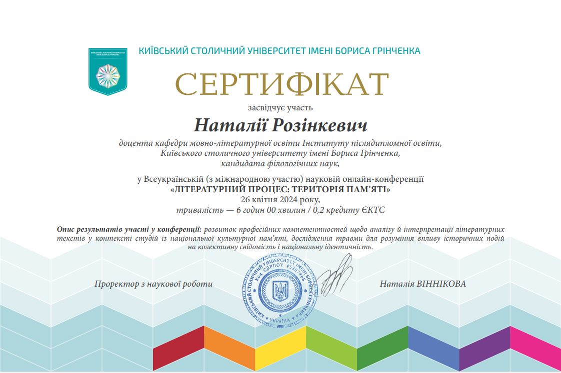 | 1094 | Інститут післядипломної освіти | Кафедра мовно-літературної освіти | 103.4 | 1 | 2024 | https://www.researchgate.net/profile/Nataliia-Rozinkevych |