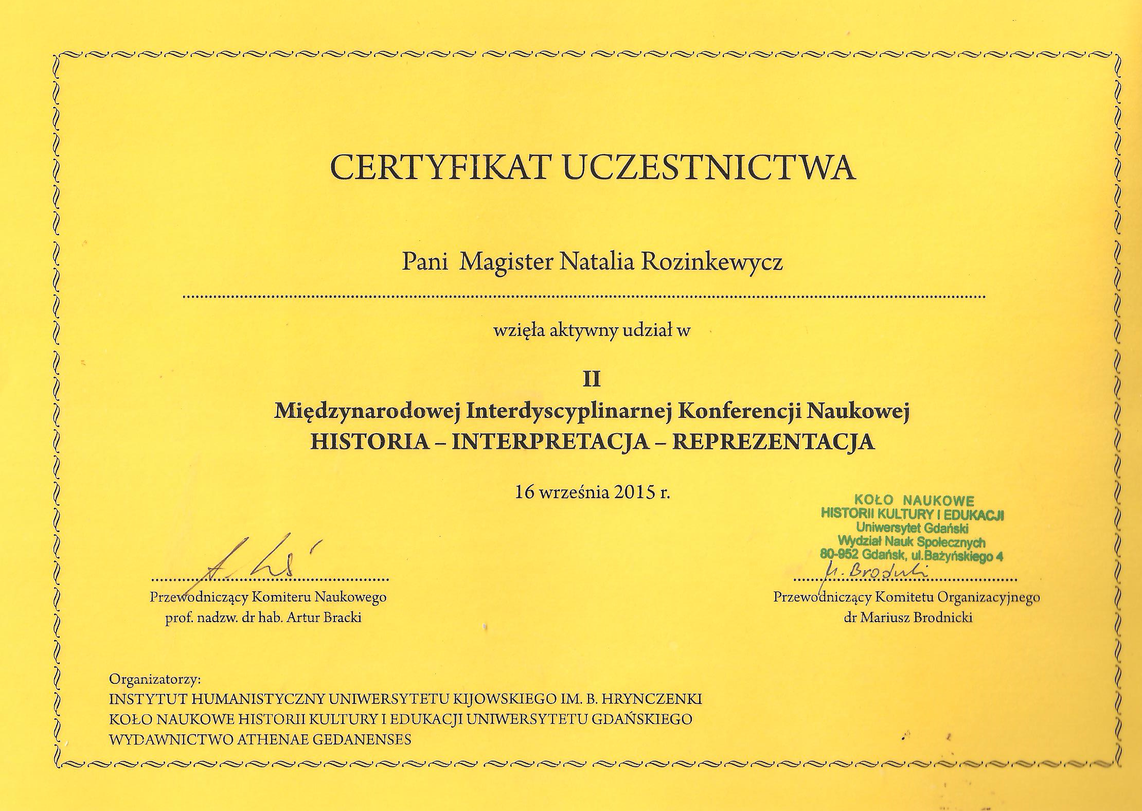| 11041 | II Międzynarodowa Interdyscyplinarna Konferencja Naukowa «Historia – interpretacja – reprezentacja» | Reprezentacja historii we współczesnej literaturze ukraińskiej (na przykładzie Księgi zmian Andrija Caplienko) | Київ, Гданськ |
