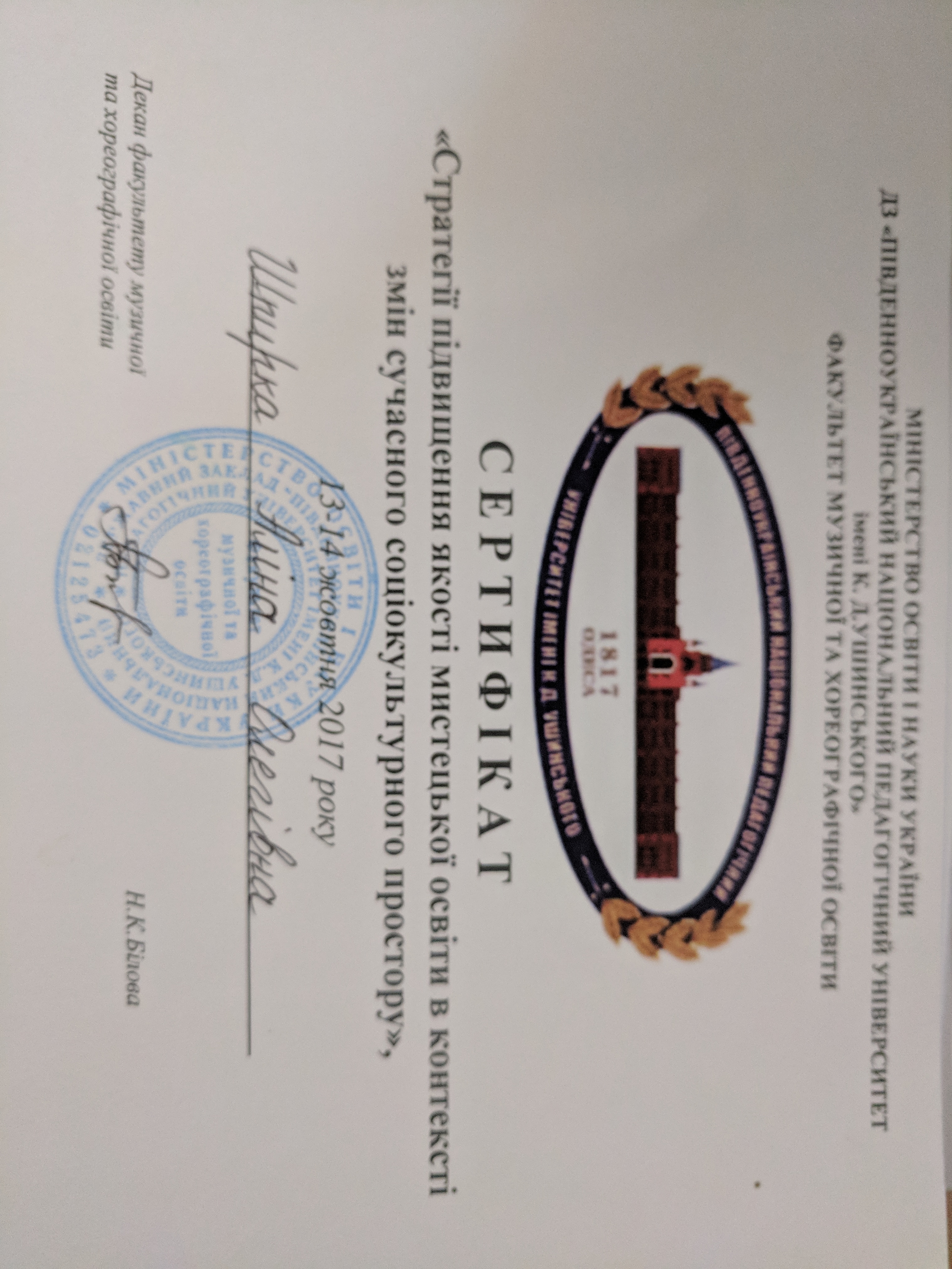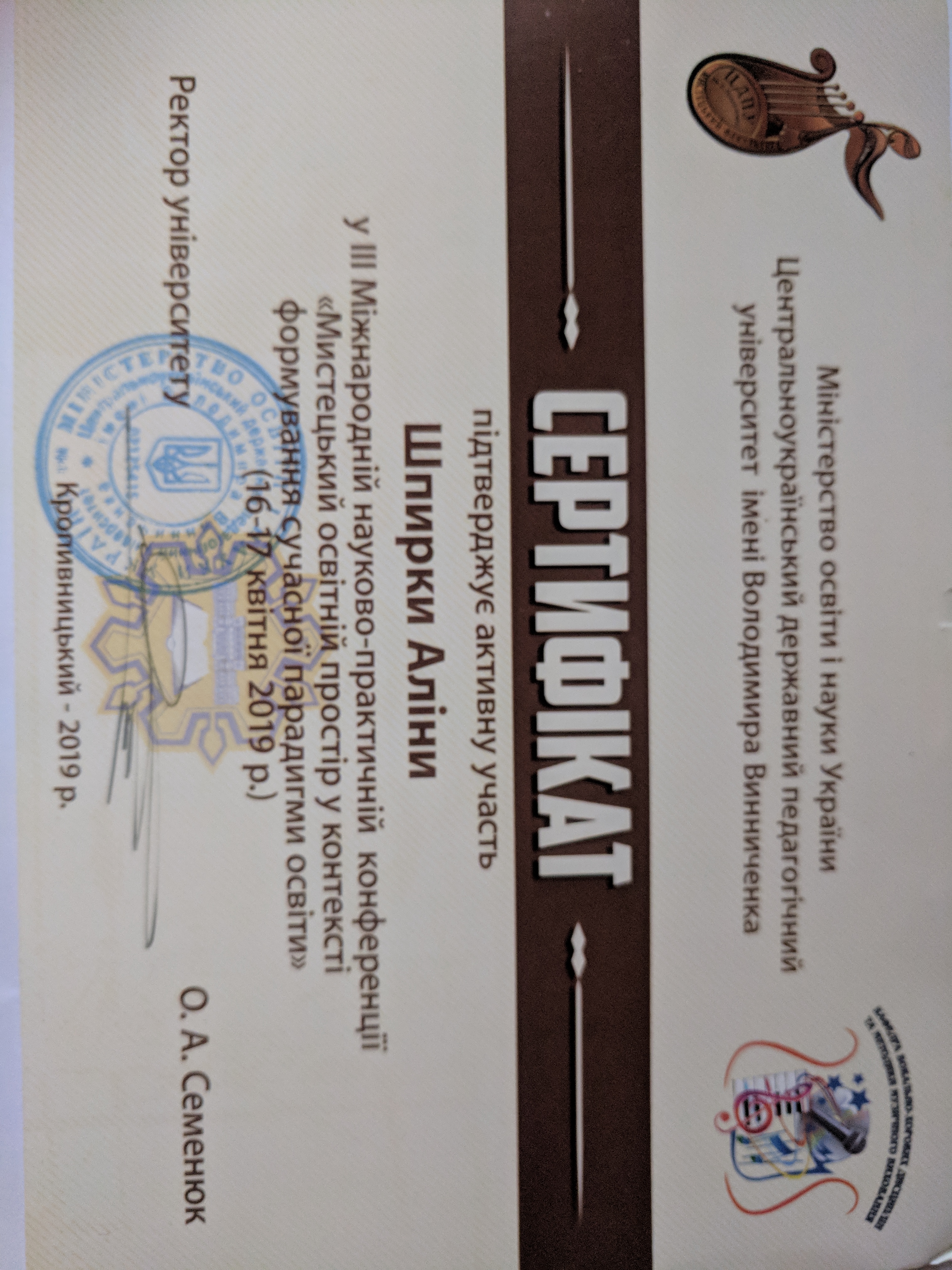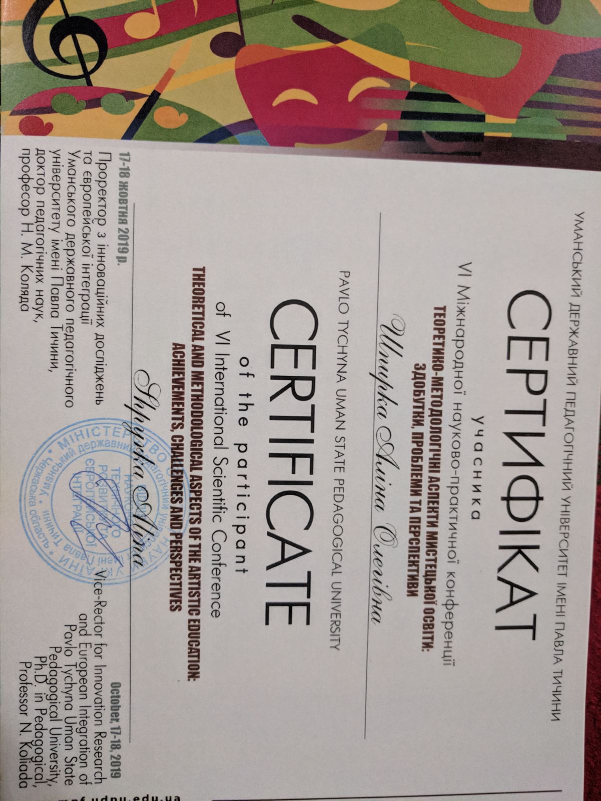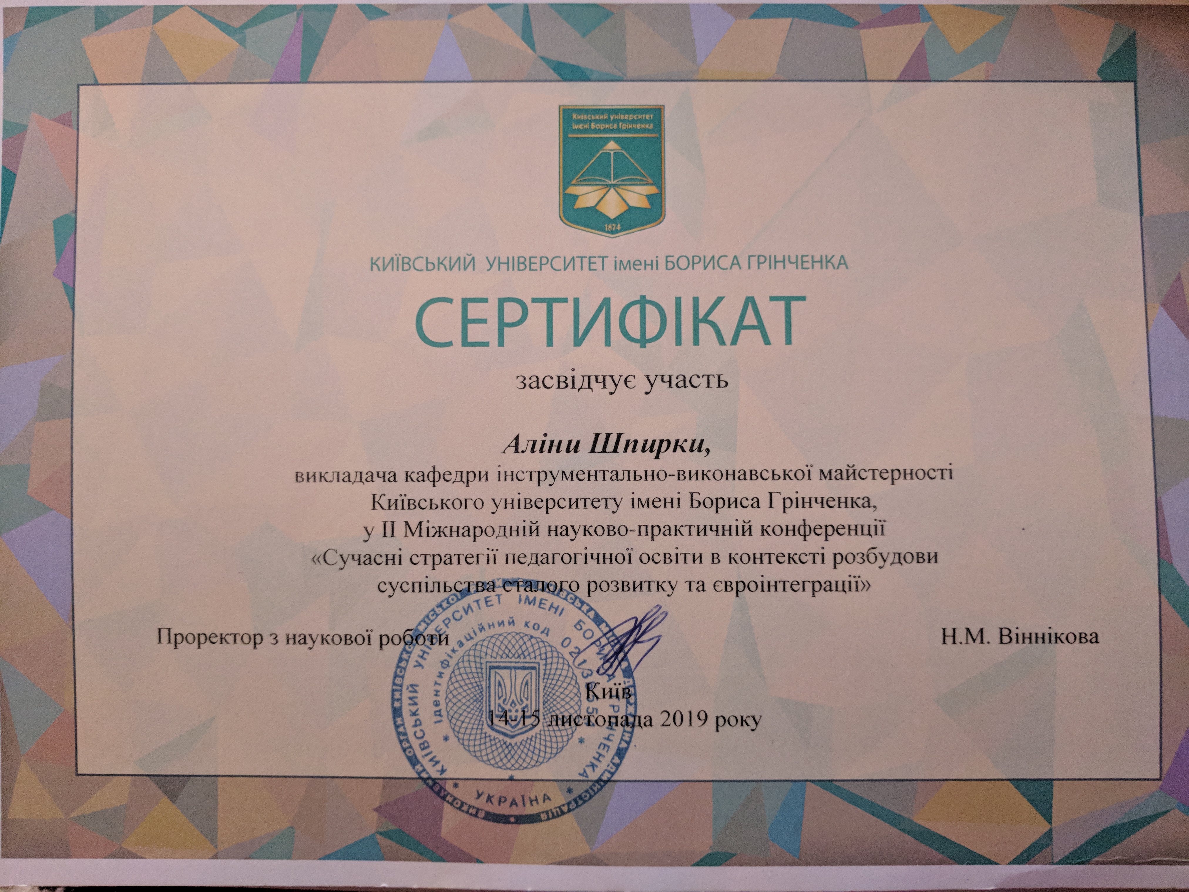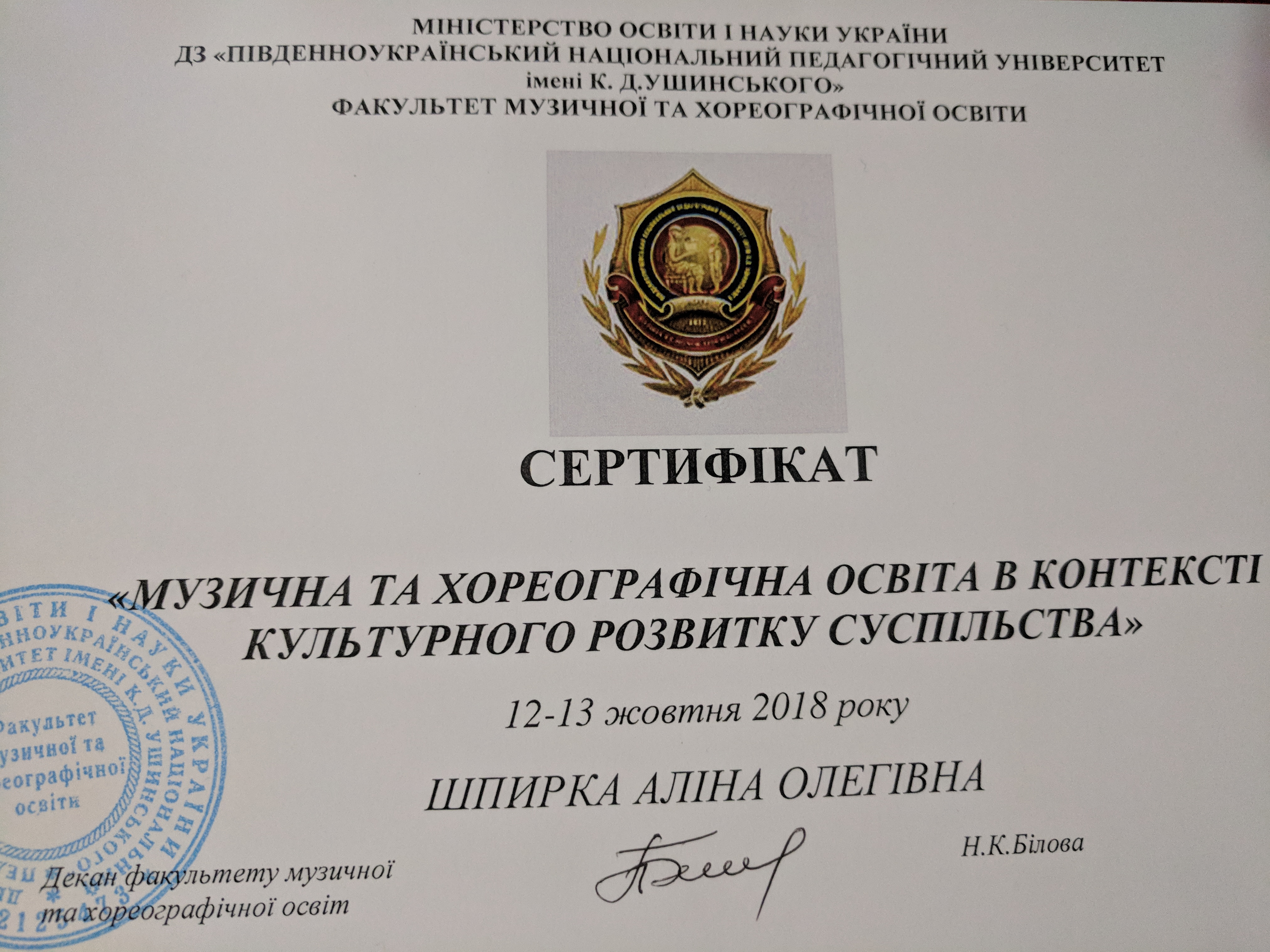 | 5893 | V Міжнародній науково-практичній конференції «Мистецька освіта XXI століття: виклики сьогодення» | «Емоційна виразність як феномен фахової підготовки майбутнього вокаліста». | м. Кропивницький | document.pdf | |