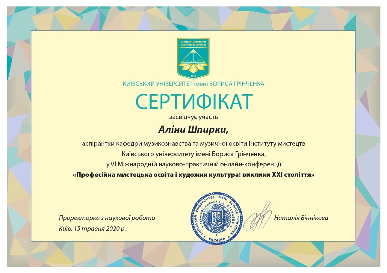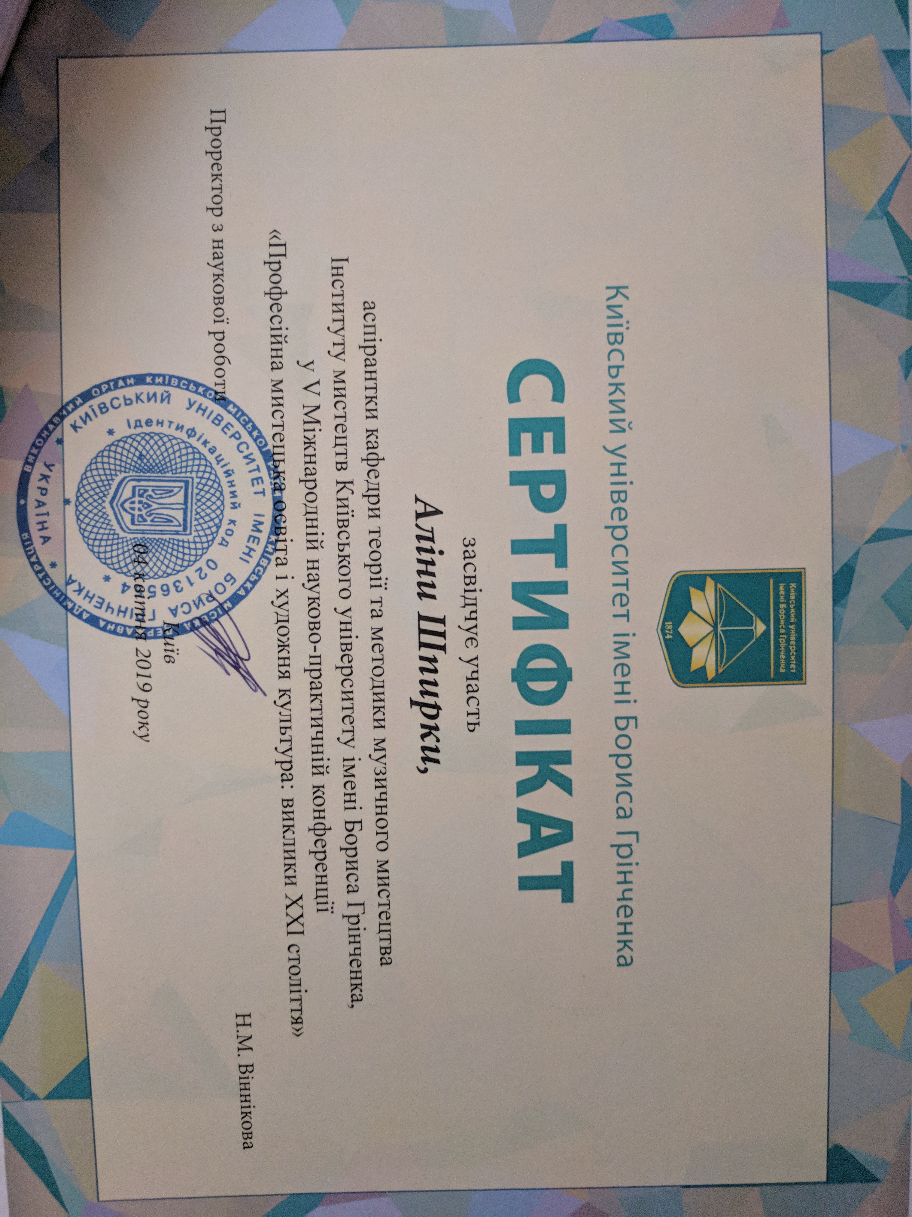 | 5992 | V Міжнародній науково-практичній конференції «Професійна мистецька освіта і художня культура: виклики XXI століття» | «Засоби формування емоційної виразності майбутнього вокаліста на заняттях сольного співу» | м. Київ |