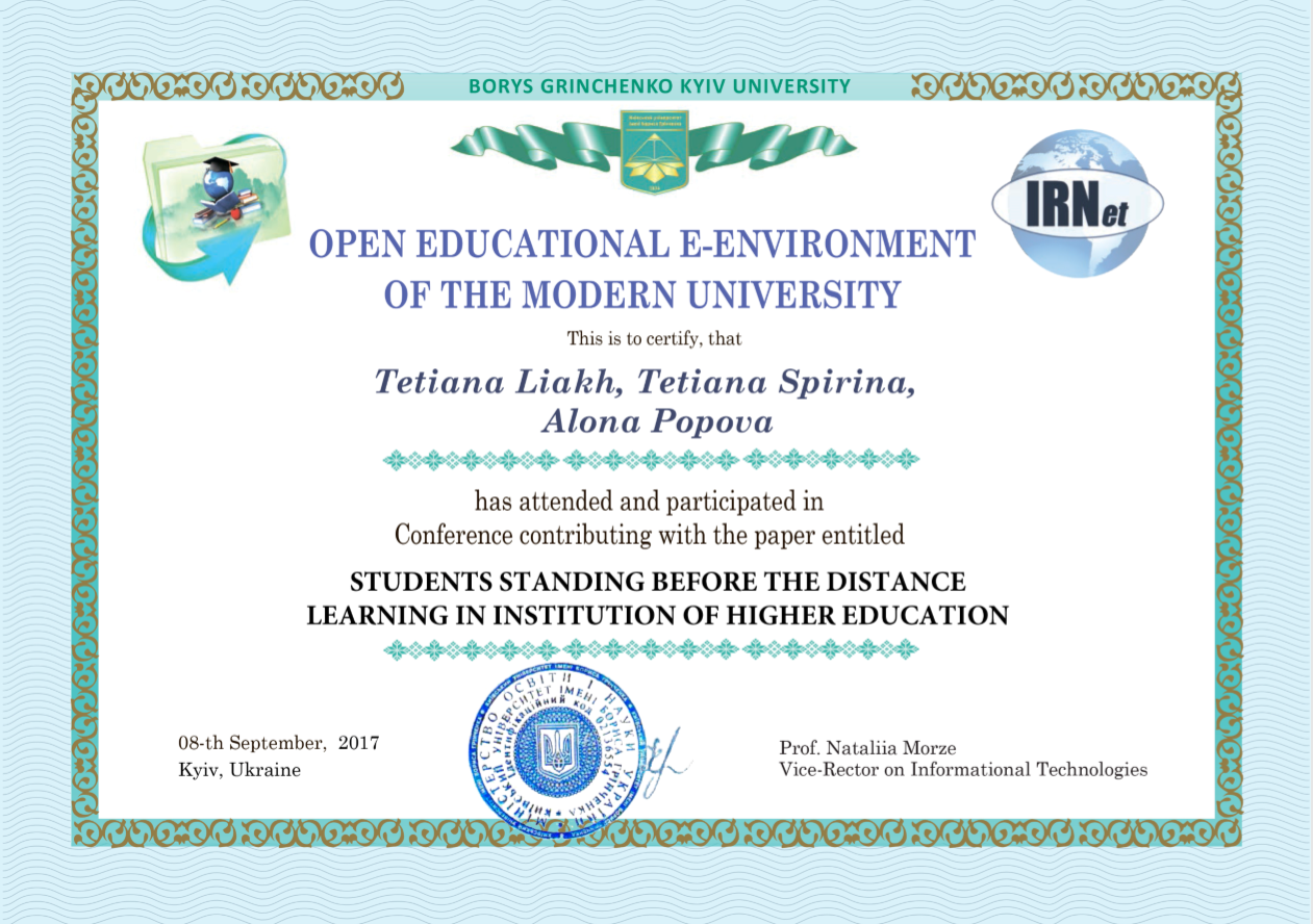 | 2625 | Відкрите освітнє е-середовище сучасного університету | Students standing before the distance learning in institution of higher education | Київ |